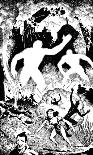 "Then I didn't have any more power to give, and Dead-Eye says, 'Gee, what's happening to all those atoms?' So I grabbed him and ran like hell for the nearest sub-basement. When those compressed atoms let go it tore everything loose from the experimental station.