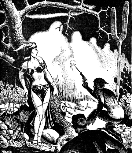 Dead-Eye patted the bulky length of the archaic powder gun strapped to his right leg. Then he jerked his hand up quickly and the white steel of the ancient Frontier .44 revolver sparkled in the light.