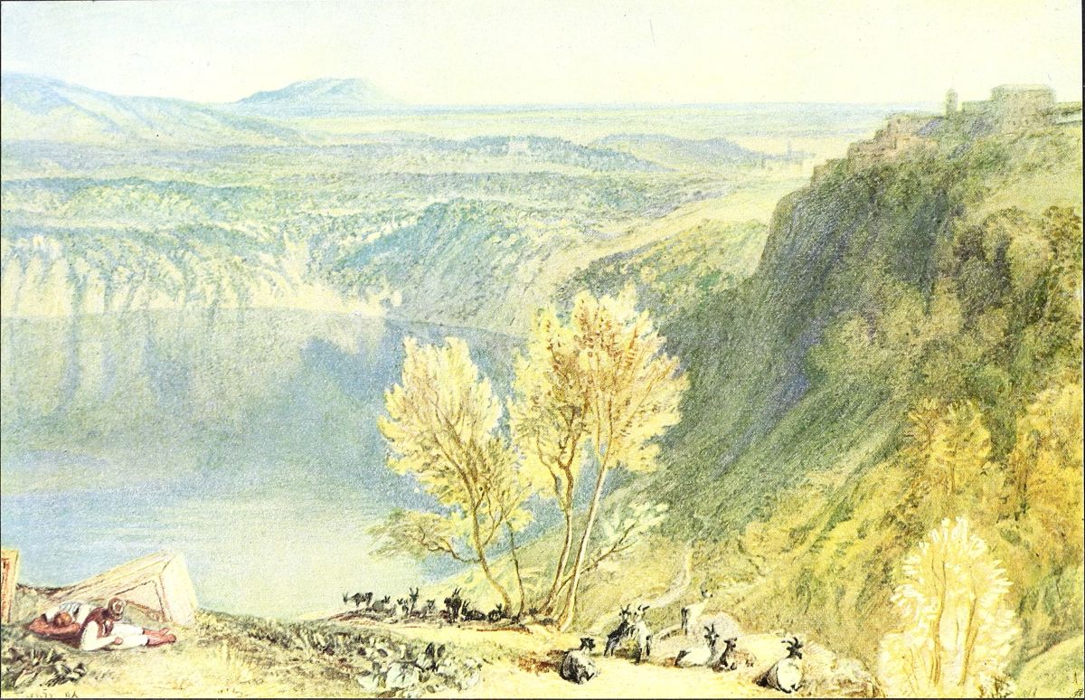 Somewhat similar in character to the “Southern Coast” drawings, but a little later and even more highly finished, is a series which Turner made in 1818-1819 from camera obscura sketches by Hakewill, an architect, to illustrate the latter’s “Picturesque Tour in Italy,” published in 1820. Ruskin, who possessed many of these, ranked them very highly and frequently alludes to them in “Modern Painters” and elsewhere. In the “Notes on his Drawings by J. M. W. Turner, R.A., 1878,” his last important work on art,{16} he describes them (p. 22) as “a series which expresses the mind of Turner in its consummate power, but not yet in its widest range. Ordering to himself still the same limits in method and aim, he reaches under these conditions the summit of excellence, and of all these drawings there is but one criticism possible—they ‘cannot be better done’.” By the kindness of Mr. Morland Agnew, two of the “Hakewill” series, The Lake of Nemi (Plate XI.) and Turin from the Superga (Plate XII.), are reproduced here.