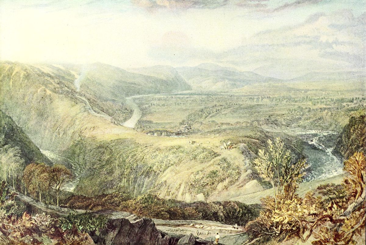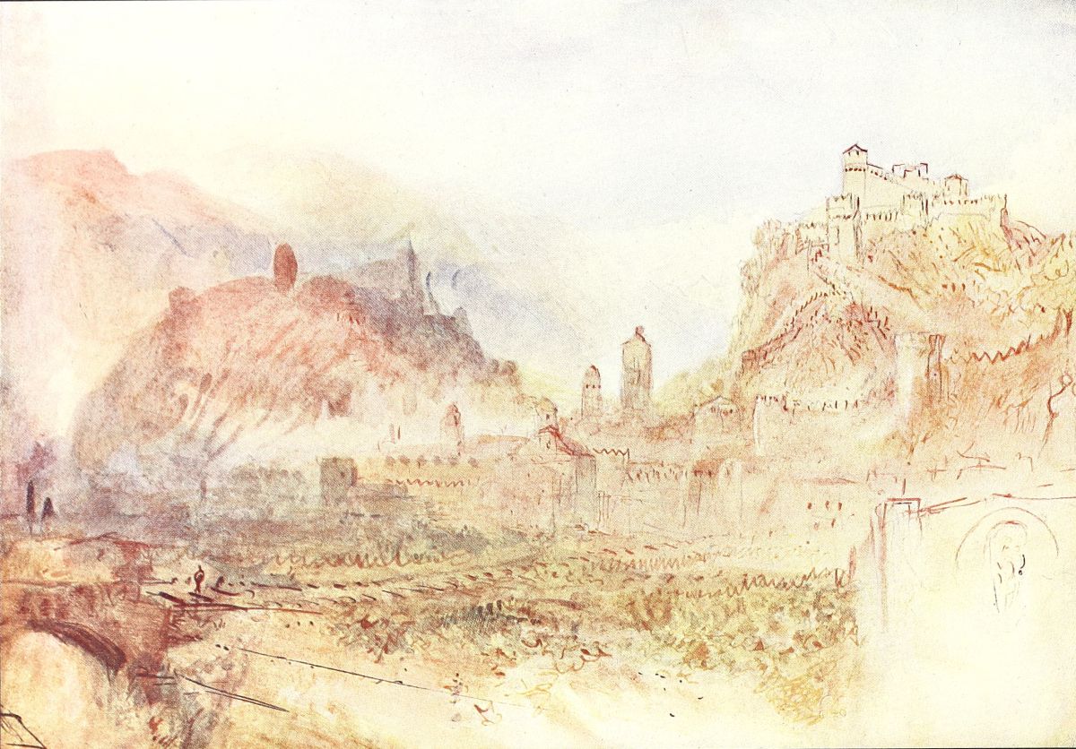 In 1802 Turner visited the Continent for the first time. He was naturally impressed with Calais, his first French town, and on his return he painted the well-known picture of Calais Pier (National Gallery), and the still magnificent but now much darkened Vintage at Mâcon (the Earl of Yarborough). But it was in Switzerland, Savoy and Piedmont that he spent most of his time, and the results may be seen in the fine drawings of Bonneville, Chamounix, and the Lake of Geneva in various collections, the Falls of the Reichenbach, the Glacier and Source of the Arveron, and others at Farnley, and the superb large body-colour sketches of The Devil’s Bridge and the St. Gothard Pass, in the portfolios of the National Gallery. Three of his Swiss drawings he sent to the Royal Academy Exhibition of 1803.