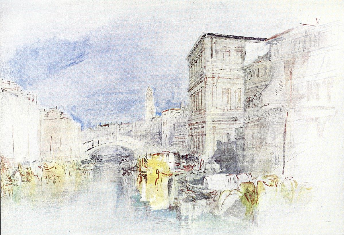 I AM particularly glad to write a foreword to this collection of reproductions of water-colours by J. M. W. Turner, as they are perhaps the best renderings of the beautiful originals that I have yet seen. The more reproductions we can have of the master’s drawings the more will it be possible to study properly his great message, and the more will his genius be recognised. I would like to see everyone of his nineteen thousand water-colour sketches and lead-pencil drawings reproduced, so that we could all hold them in our hands and carry them about with us; for in them there is an unfailing beauty of composition, and a glorious truth of effect and of detail, by which Turner managed to make complete pictures out of even the fewest touches. No one realises Turner’s full genius till he studies these drawings, often made in the very presence of nature. They teach us to look at her with a new and seeing eye. Their absolute truth has hardly yet been fully recognised. I have had the fortune to carry reproductions of these drawings with me in Wharfedale and in Venice, and I have compared them touch for touch with nature. Often and often have I been able to see the meaning of what appears a careless scratch or even an accidental wriggle, only when the actual scene was before me. They are mostly drawn from one exact spot, as may be seen by the crossing of the branches of the trees, although these are now so many years older, and the folding of the hills. It was in the seventies that I first made these comparisons in Wharfedale and I still remember my delight at recognising the gnarled markings on three ash trees a little below Bolton Abbey; the angle of their growth forming a rough letter N was identical although they were mere saplings in Turner’s drawing, and even the broken bank of the river was still the same, all the winter floods of variable Wharfe not having washed away nature’s truth to Turner’s drawing. My experiences in Venice are similar. With the reproduction in my hand I could say that Turner drew a particular scene from a particular flagstone on the quay, or piazza. The lines of the houses on both sides of the canal cut one another in the exact way they did in Turner’s sketches only from one particular spot, but from there the whole scene was complete exactly. Many subjects were sketched from the middle of the canal and owing to the movement of the water it was not easy to compare exactly the reproductions with the scenes in nature. Curiously nearly all these scenes from the canal were taken from the traghettos, or ferries, of which there are several up and down the Grand Canal, where gondolas wait for hire, tied to their posts, somewhat as cabs stand in their ranks in our streets. It is possible that Turner in his economy made use of these waiting gondolas by giving the gondolier a palanca for{2} permission to sit in a gondola whilst it was thus at rest. It was an ideal place for working from in his day, for no “penny steamboats” then splashed up and down the canal making things rock in their wake, but peace reigned in the reflections of the palaces.