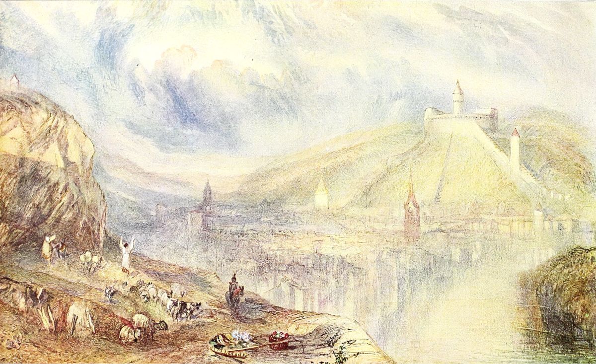 Up to about 1830, Turner’s finished drawings were mainly in transparent water-colour, but from a quite early period he employed body-colour in his sketches, especially whenever speed was necessary. “Body-colour,” it need hardly be said, is ordinary paint mixed with Chinese white or some other opaque white substance in place of water, and is frequently used on a grey or neutral coloured paper, by which means the work is much more rapid. He had recourse to that method on one memorable occasion. In 1817 he went for a three weeks’ tour in the Rhine district, and during that time produced no less than fifty drawings of fair size, i.e., at the rate of about three a day. He first stained the paper a uniform bluish-grey, which, although itself sombre in tone, effectively shows up the body-colour work, and must have effected an immense economy of time as compared with ordinary transparent colour. When he returned to England he took the drawings in a roll straight to Farnley Hall, and Mr. Fawkes, to his delight, bought them at once for £500. For a long time they remained in a portfolio unbroken, one of the treasures of the house, but a few years ago some were dispersed at Christie’s. One of these, Goarhausen and Katz Castle, is reproduced here (Plate X.).