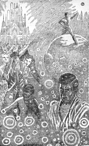 Profaldo and Senar were behind me. What conditions would I meet in the next city, Caldray? My wildest dreams did not prepare me for the reception that was to be mine. Scarcely had I entered Caldray when I stopped short, staring at the scene ahead. The streets were jammed with citizenry. In blazing ato-bulbs high overhead was the single word TEPONDICON. Flags and pennants hung from every balcony.