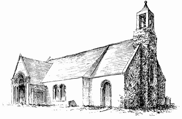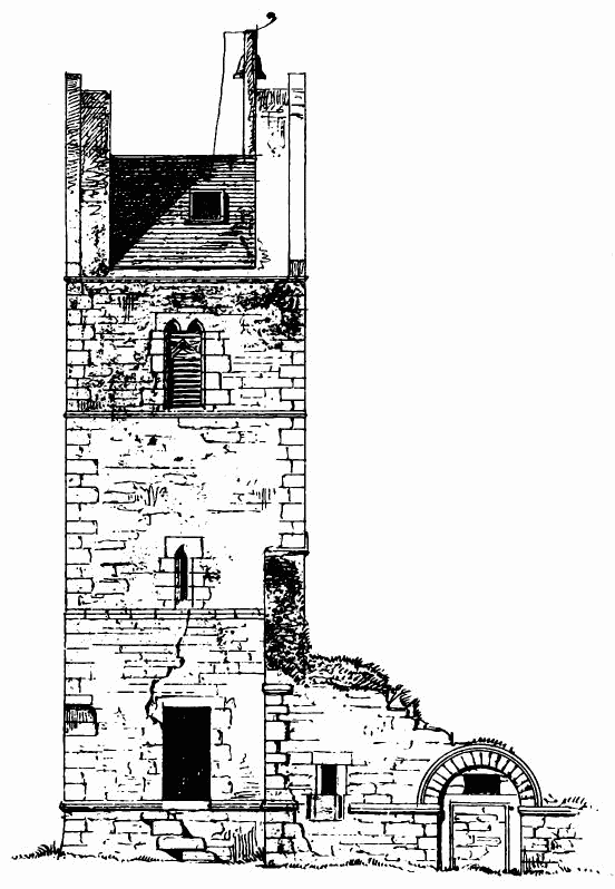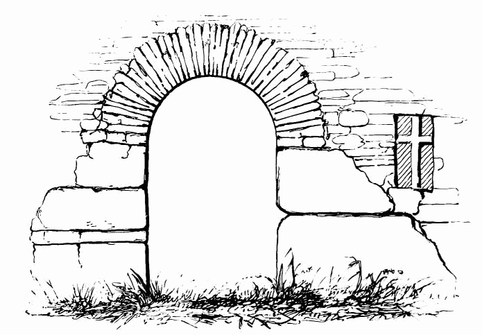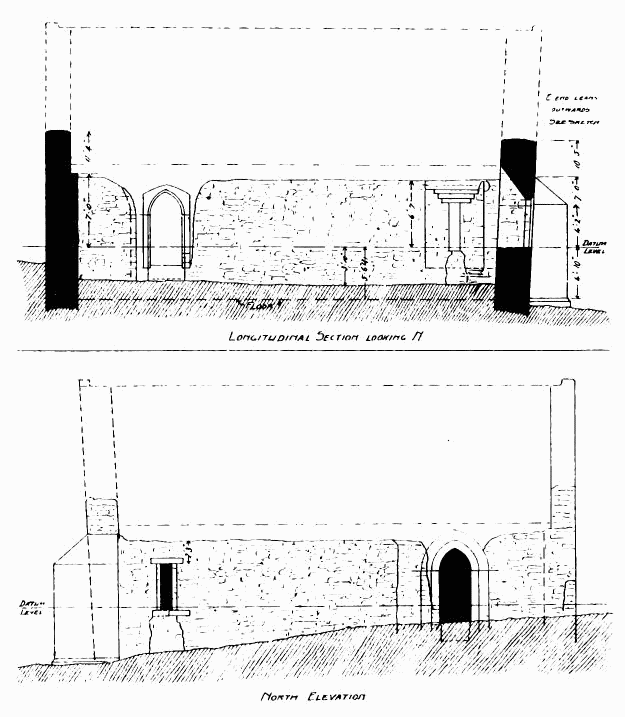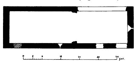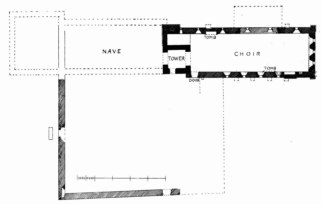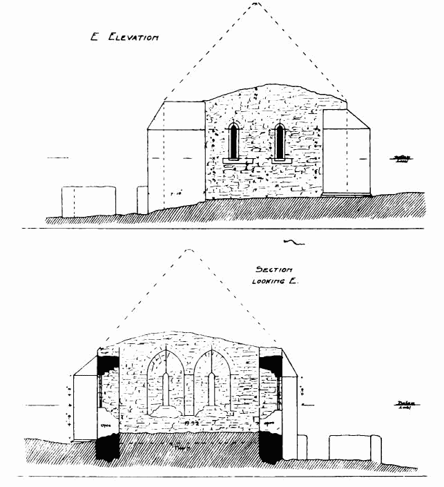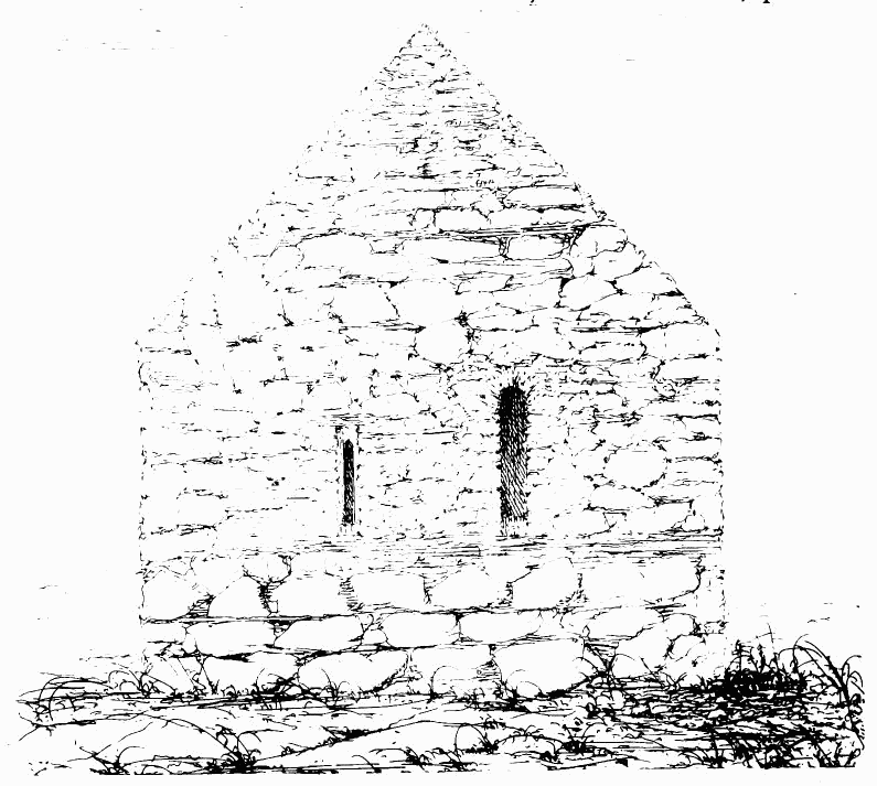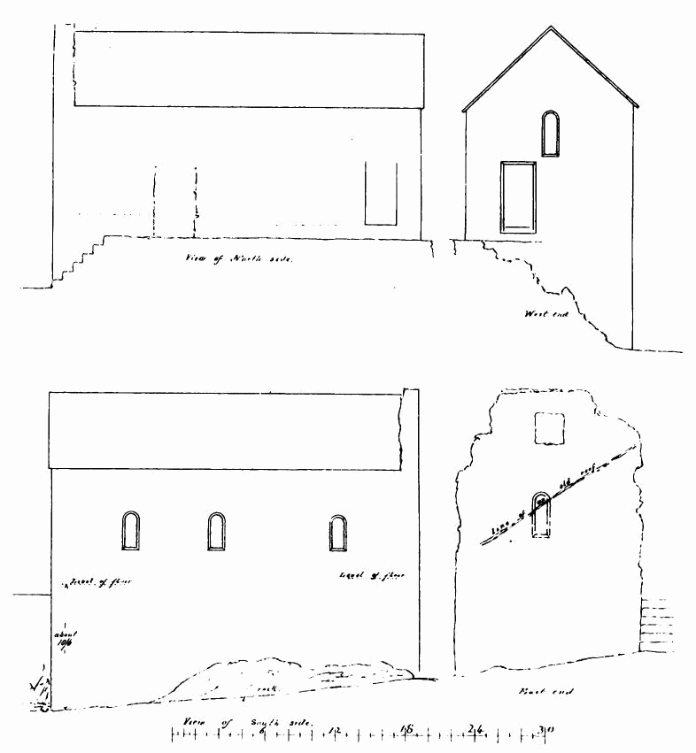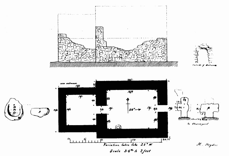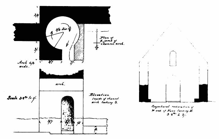 about 24 feet; length of nave 56 feet by 30 feet in width. The chancel is full of rubbish, especially at the place where the arch is usually situated; but it is not unlikely that by digging here some remains might be found sufficient to indicate the style and period of the building. From Carr’s description it appears to have been a Norman building, as he speaks of a “small Saxon arch” (the term frequently used by writers about the beginning of the century for a Norman arch) as visible in his time (p. 243).