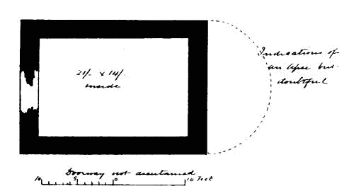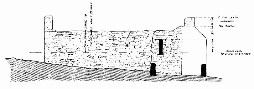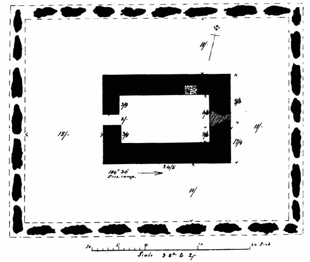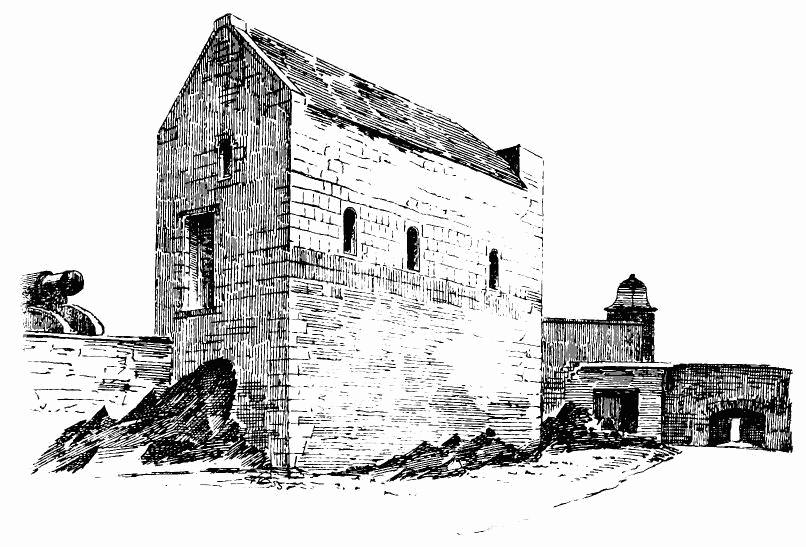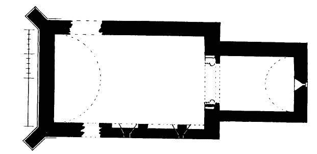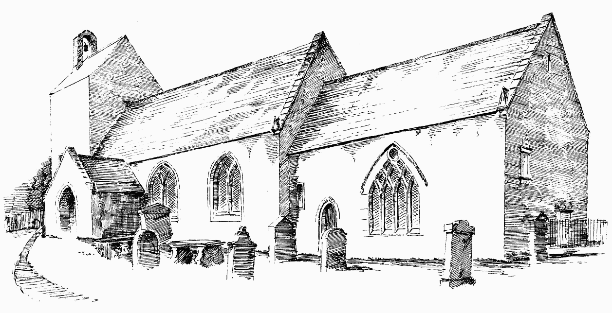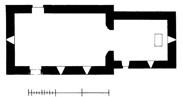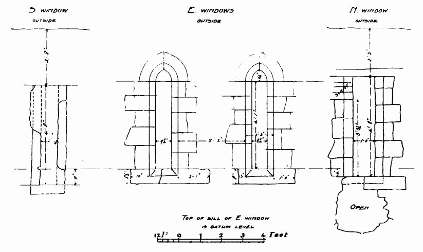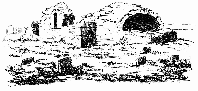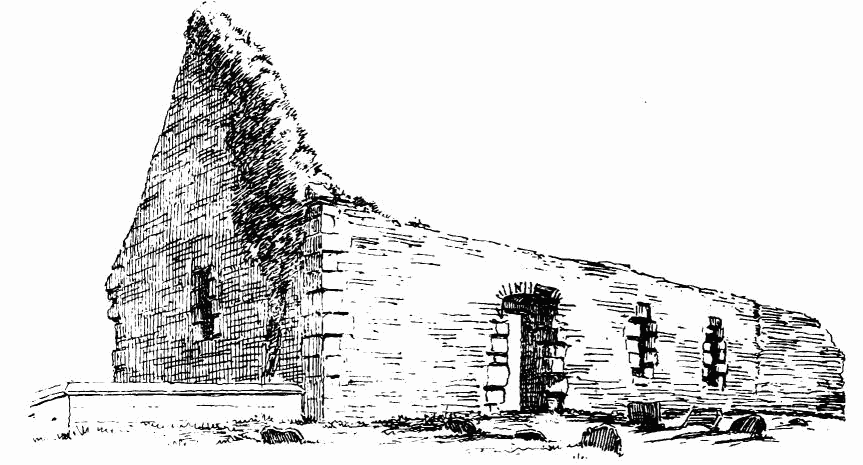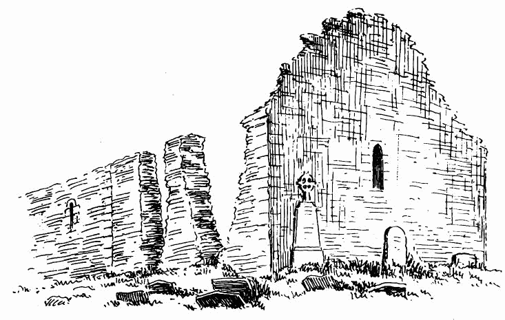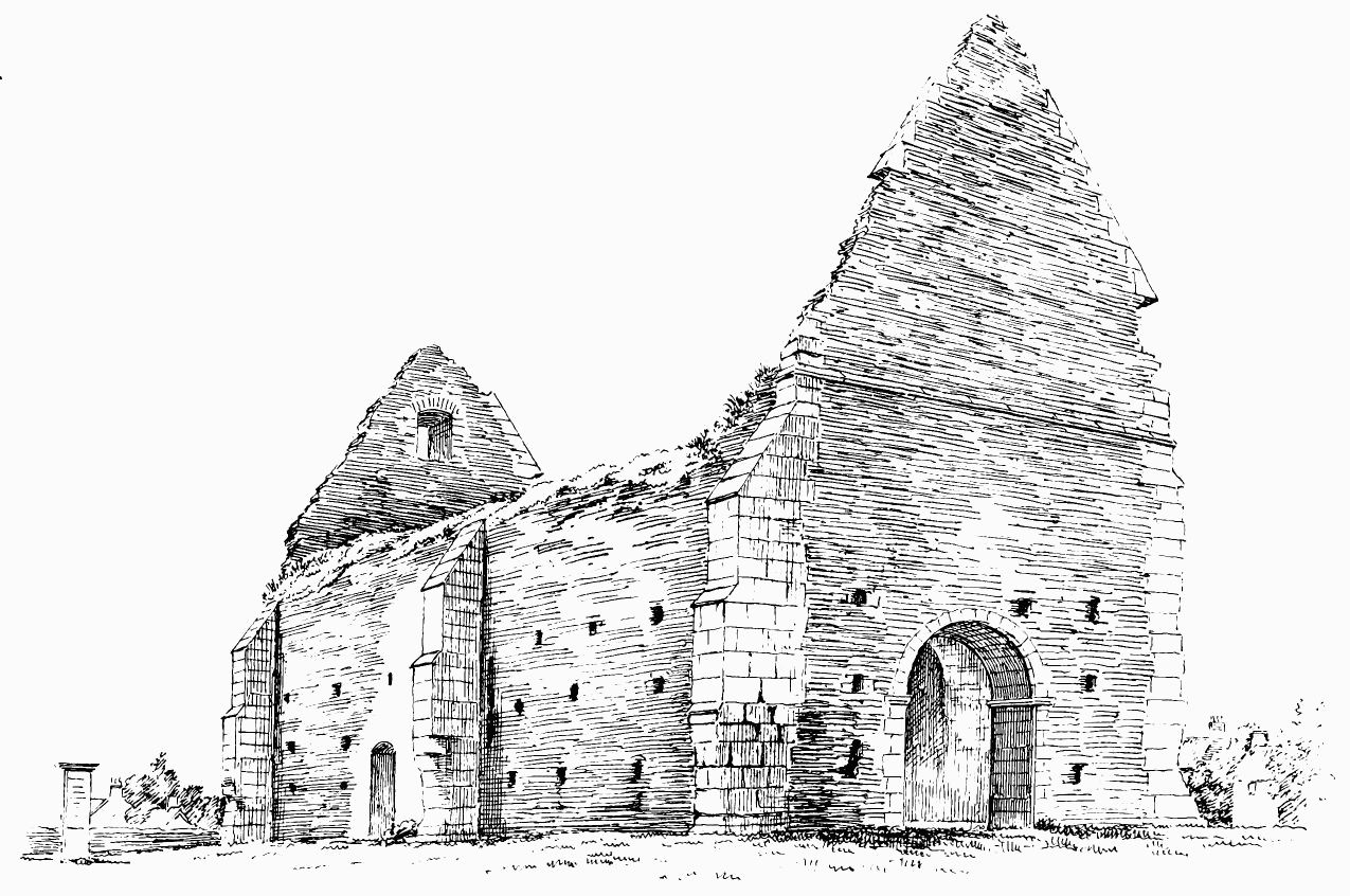 about 24 feet; length of nave 56 feet by 30 feet in width. The chancel is full of rubbish, especially at the place where the arch is usually situated; but it is not unlikely that by digging here some remains might be found sufficient to indicate the style and period of the building. From Carr’s description it appears to have been a Norman building, as he speaks of a “small Saxon arch” (the term frequently used by writers about the beginning of the century for a Norman arch) as visible in his time (p. 243).