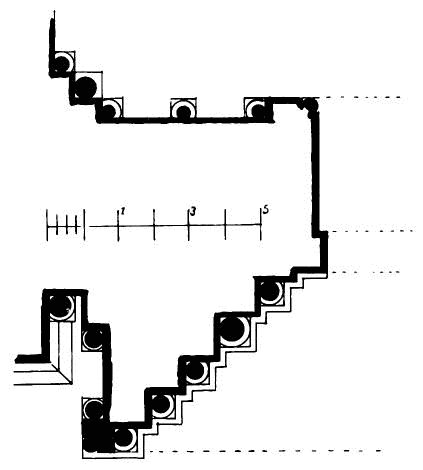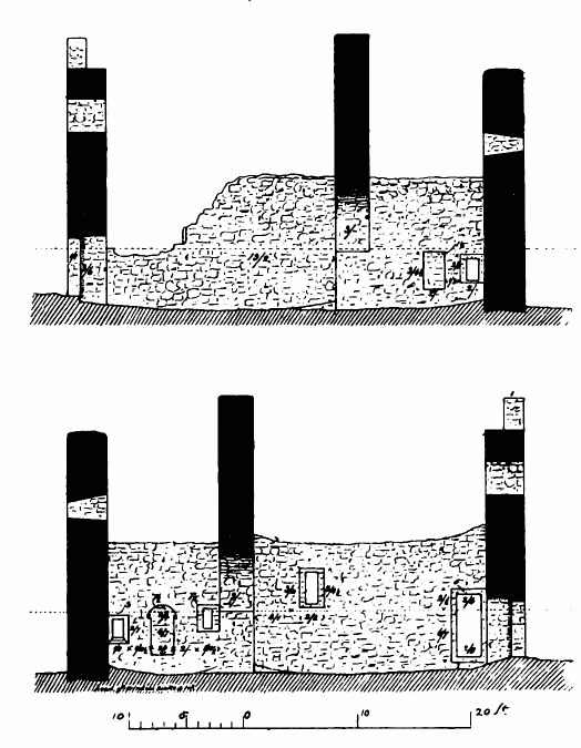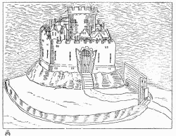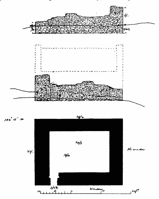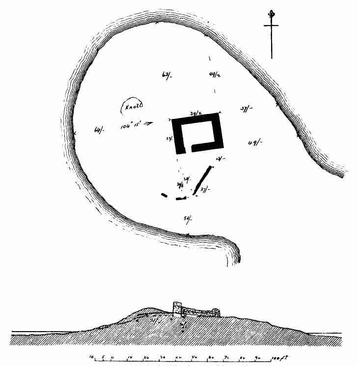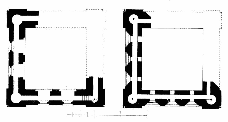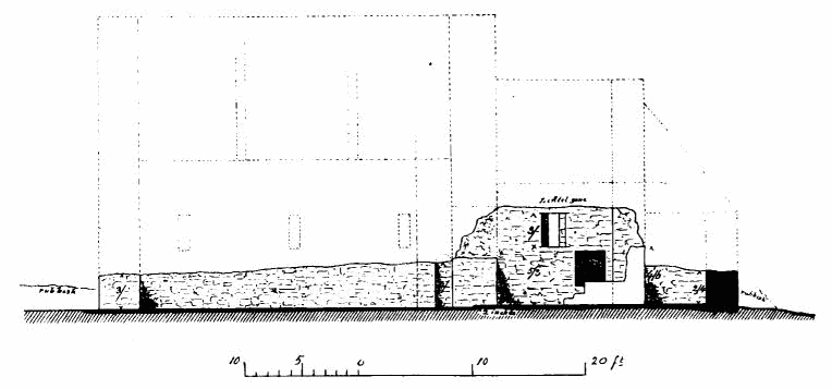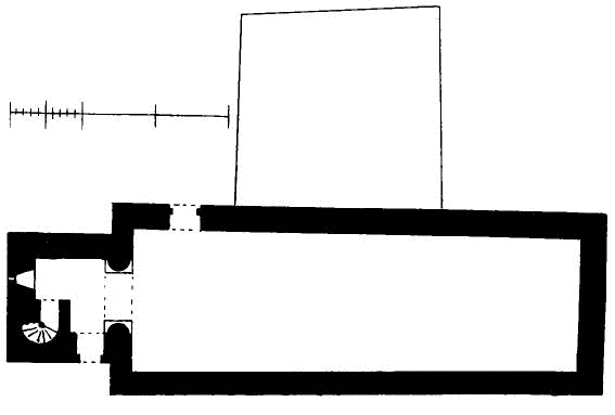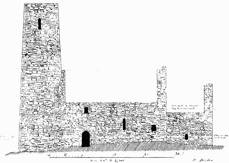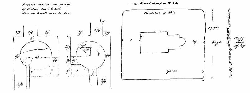 [144] The lines on south side of tower show foundations now exposed, and a built-up door in south wall of tower is not shown, being apparently not original.