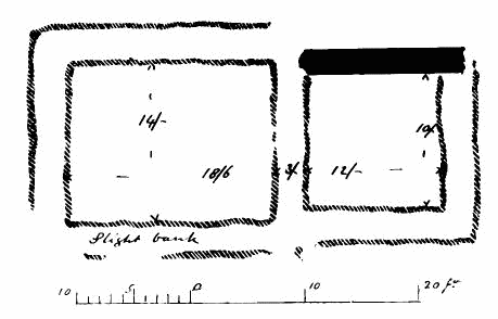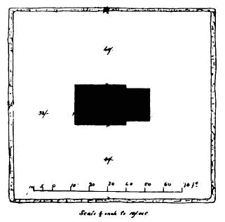 The one to the south-east, called St. Abb’s Chapel, (1) is situated in the centre of a churchyard, all the remaining tombstones of which were thrown into the sea during some law proceedings regarding the right of access by the public to St. Abb’s Head. At the time Carr wrote his History of Coldingham Priory (published 1836), the walls of the church were standing to a height of some three or four feet; now only the grass-covered foundations remain. These indicate a chancelled building, the outside dimensions of which are:—length of chancel from east to west about 21 feet, width