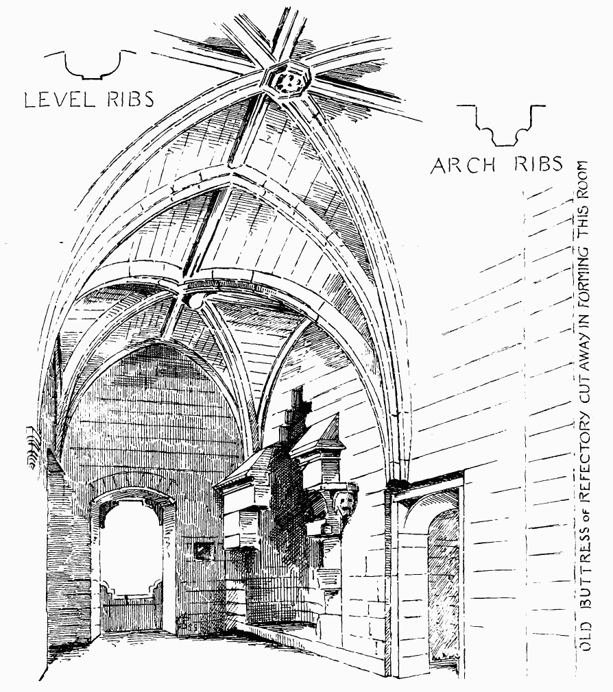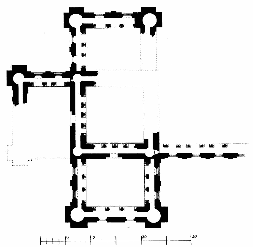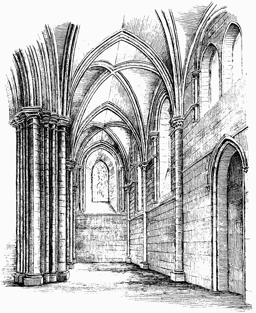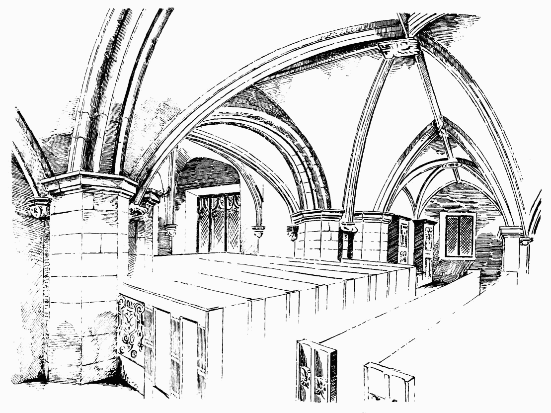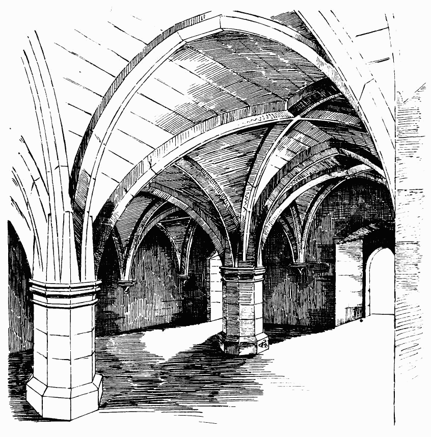 The plan consisted of an open court or cloister, sur{vii}rounded by a covered walk, having on one side (generally the north side) the nave of the church; while on the east side, in connection with the transept, lay the sacristy, chapter house, and frequently the fratery or day-room of the monks, on the upper floor of which range extended the dormitory, library, &c. The south side of the cloister was occupied by the refectory and kitchen; and the west side contained cellars and stores, and apartments for the lay brothers and guests.