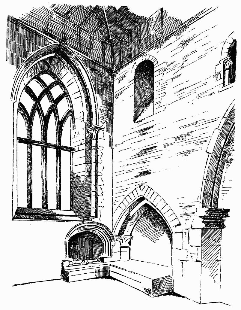 [150] The sketch is a very slight and hurried one, and is not at all finished in detail; but it is enough, when taken with the other drawings, to enable a fair idea to be formed of the completed church. The tower has had a clock dial, placed so as to conceal the south windows. The traceried windows of the south aisle of the nave are indicated, along with the lintelled doorway and a raised window, which may have been over an outside stair in connection with a gallery. The east window of the aisle is shown built up, with a square shuttered window inserted where the mullions formerly were, and the small window above has been enlarged for light to the gallery. The view of the chancel is particularly interesting, this part of the church having now almost disappeared. In the choir a mullioned window of three lights is shown above the sedilia, and a small door is knocked through the latter. The east end is shown lighted by three simple lancet windows.