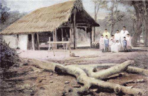 Just a few words more about these Brazilian Brownies before we make our way to the coast. From its birth the Indian baby is seldom parted from its mother, until it learns to walk. A few days after baby is born mother takes it to the plantation, protecting the little head from the heat of the sun by a banana leaf. When on a visit to distant relatives they take all their goods and chattels with them; and when paddling down the river the little ones help father to row, while mother sits at the helm nursing baby.
