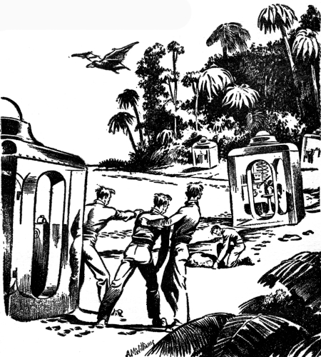 "Dingus!" he screeched. "You don't pull any dingus! You gently depress—gently, you hear!—the chronotransit, that large black lever, thus sliding the quartzine door shut and starting the machine. When you arrive you lift it—again gently—and the door will open. The machine is set to go back a given number of years, so that fortunately you have no thinking to do."