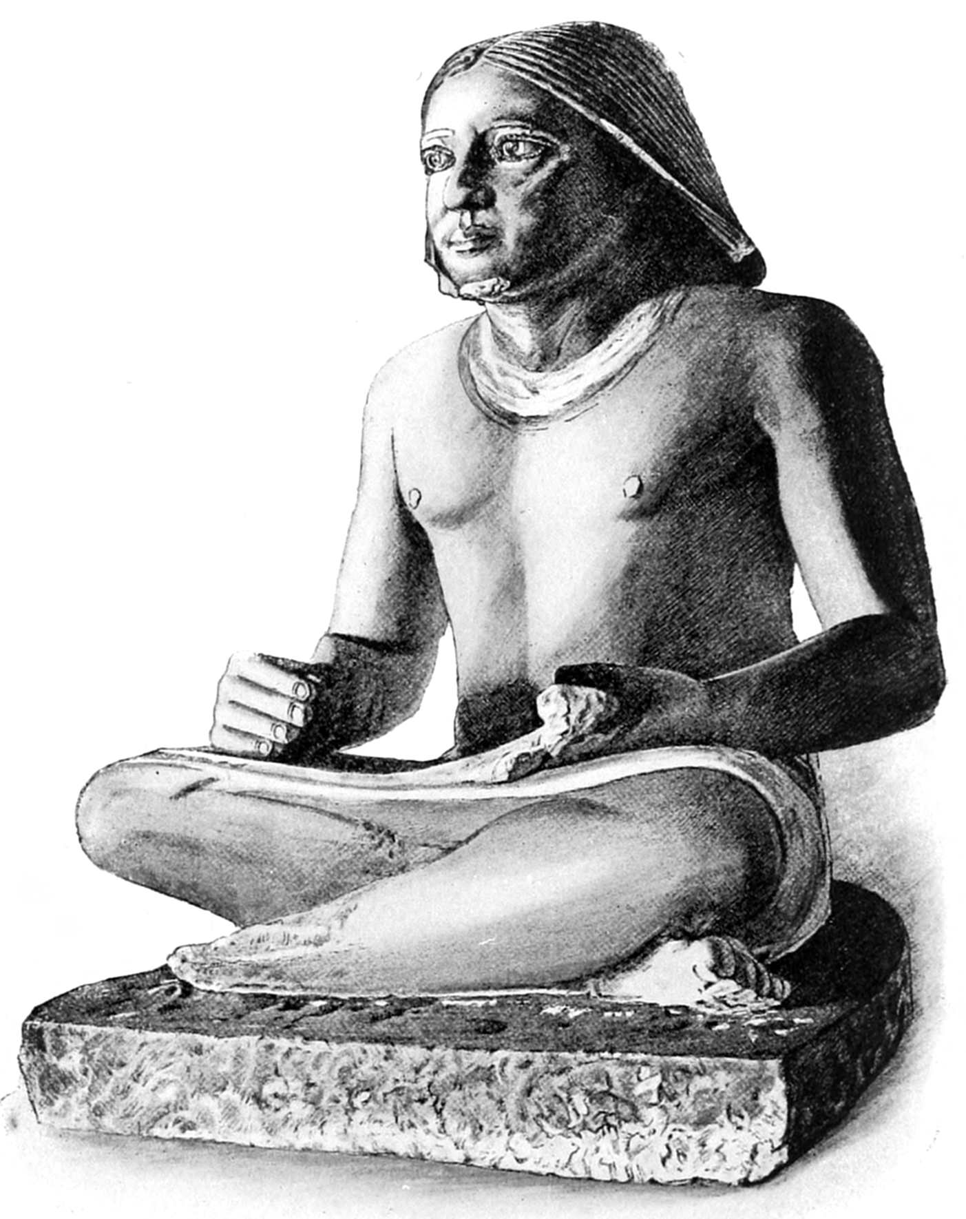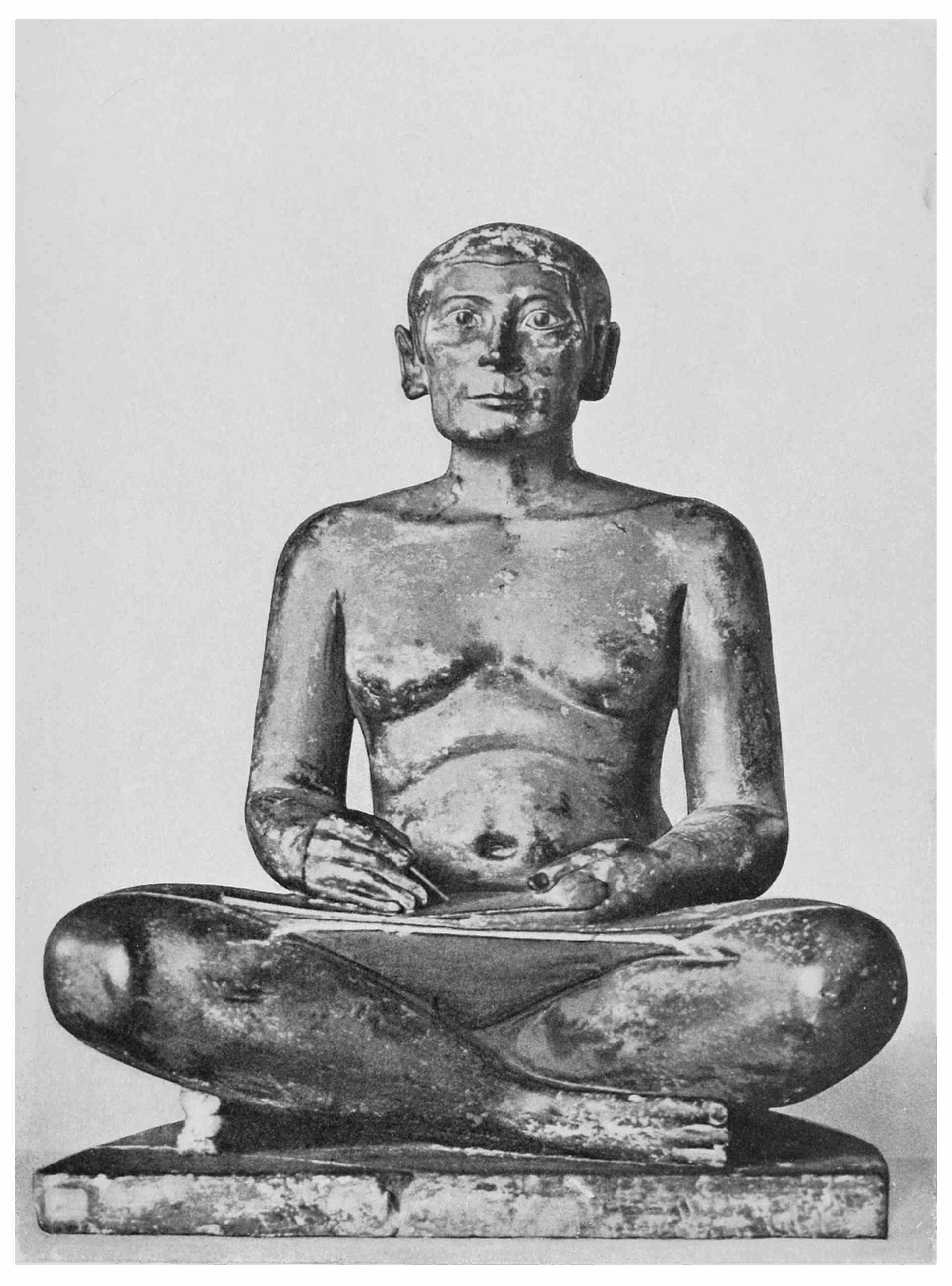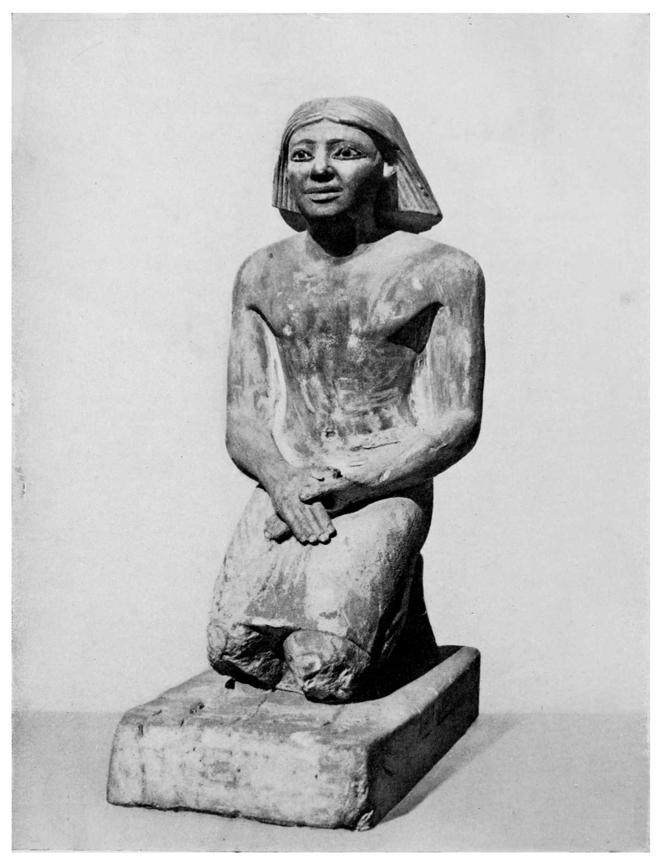 37 Mariette, “Notice des principaux monuments du Musée de Boulaq,” 6th edition, 1876, p. 235, No. 769: “Memphis. Saqqarah—limestone II, 1 foot 2 inches—kneeling figure. His hands crossed on his legs. His eyes are of mosaic work and formed of several stones curiously combined.” The statue of the kneeling scribe figures in a group in Plate XX of Mariette’s work, “Album du Musée de Boulaq,” containing 40 plates, photographed by MM. Délié and Béchard, with explanatory text edited by Auguste Mariette-Bey. Cairo, Mourès et Cie, 1871, fol.