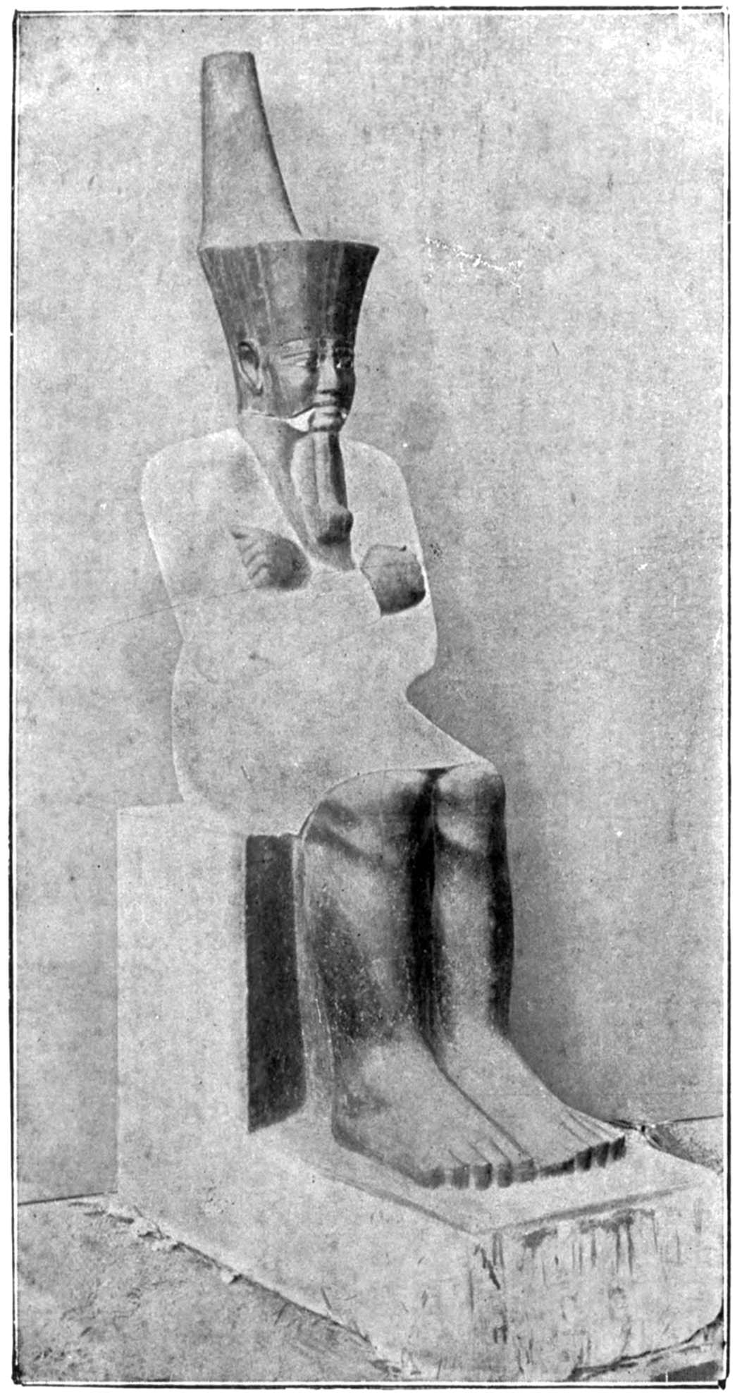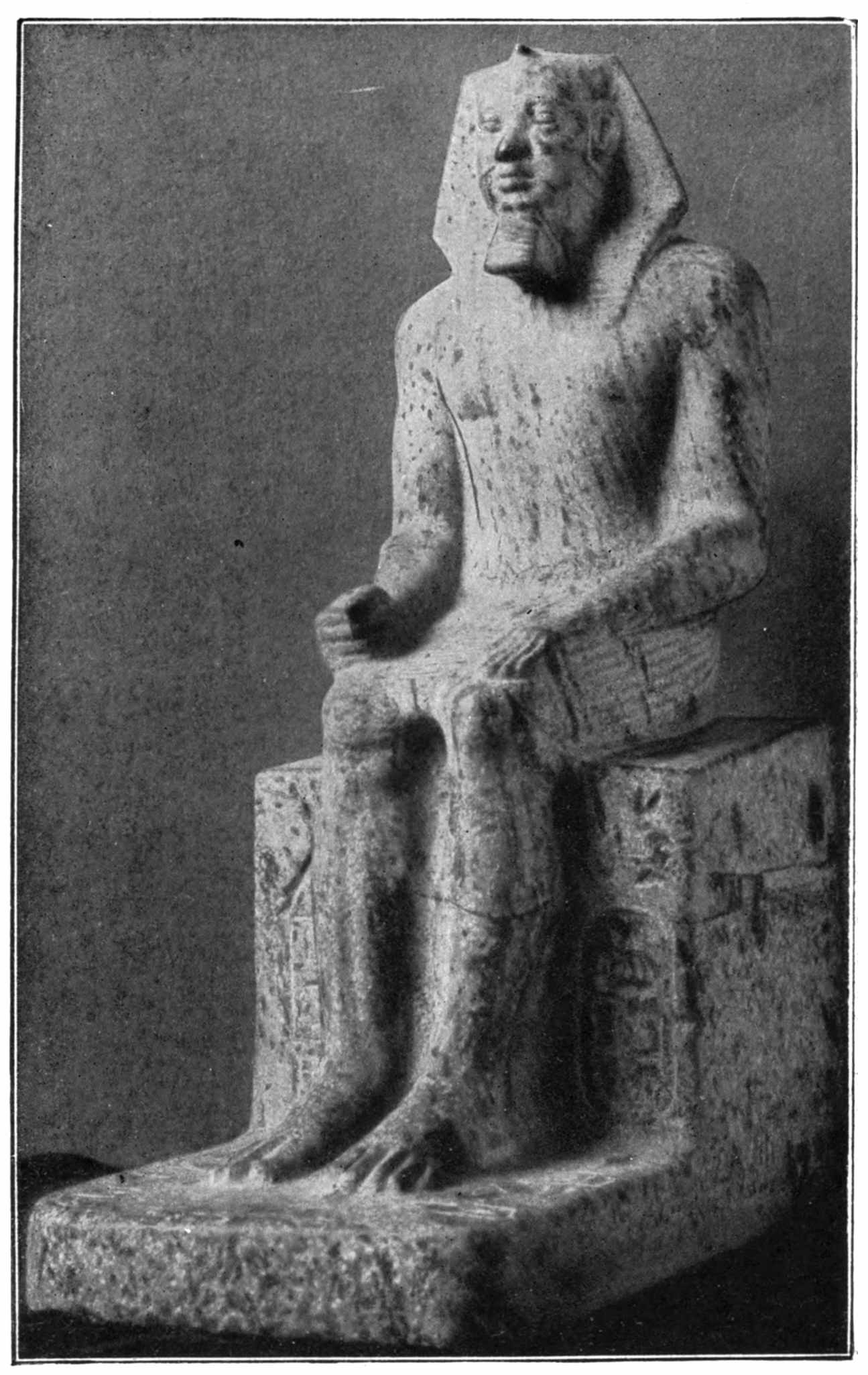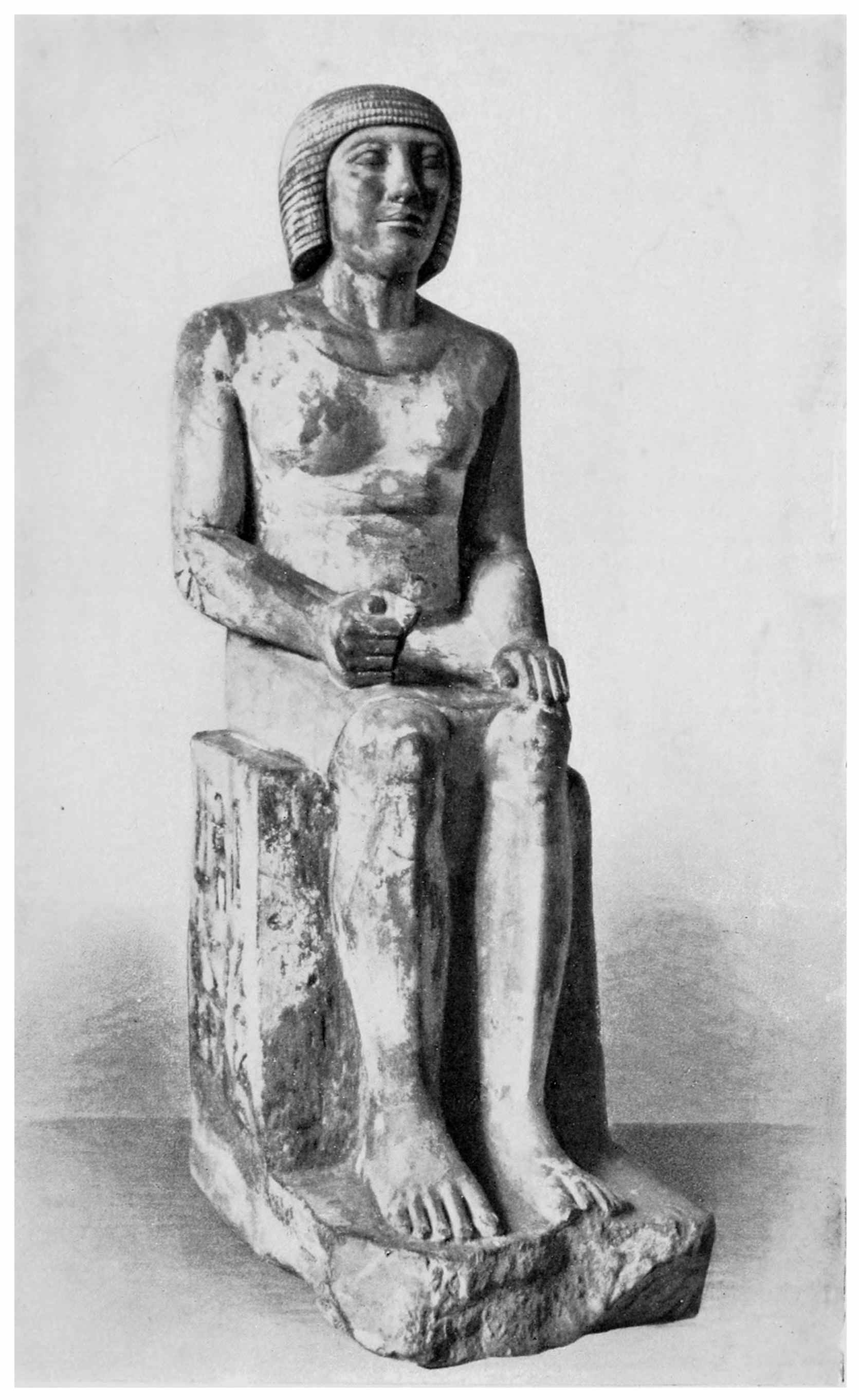 37 Mariette, “Notice des principaux monuments du Musée de Boulaq,” 6th edition, 1876, p. 235, No. 769: “Memphis. Saqqarah—limestone II, 1 foot 2 inches—kneeling figure. His hands crossed on his legs. His eyes are of mosaic work and formed of several stones curiously combined.” The statue of the kneeling scribe figures in a group in Plate XX of Mariette’s work, “Album du Musée de Boulaq,” containing 40 plates, photographed by MM. Délié and Béchard, with explanatory text edited by Auguste Mariette-Bey. Cairo, Mourès et Cie, 1871, fol.