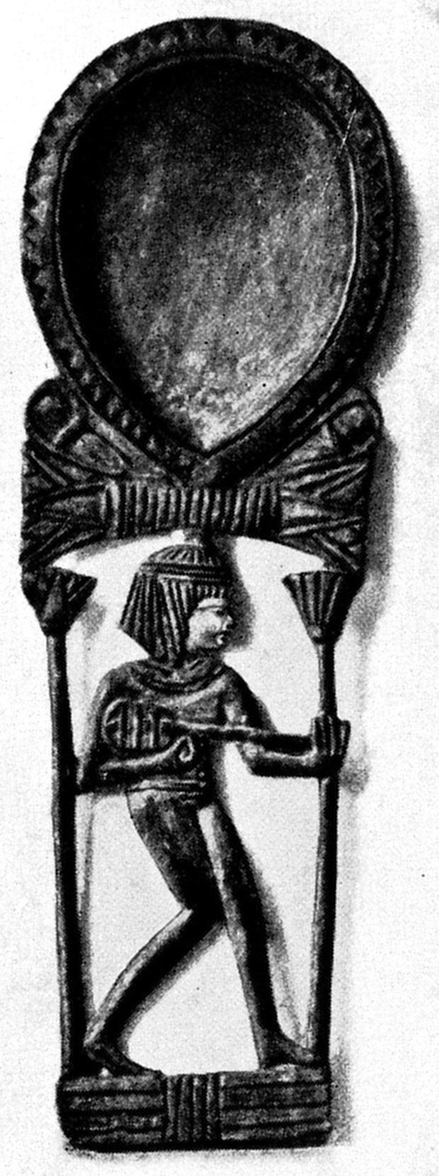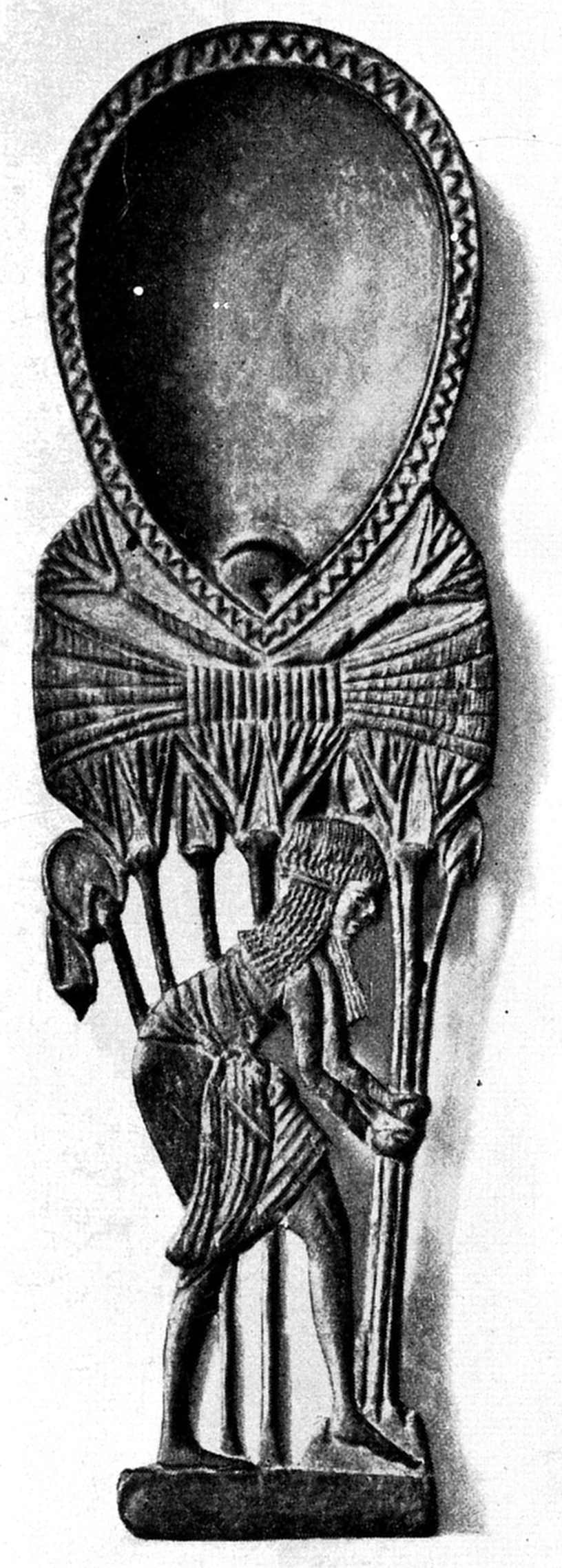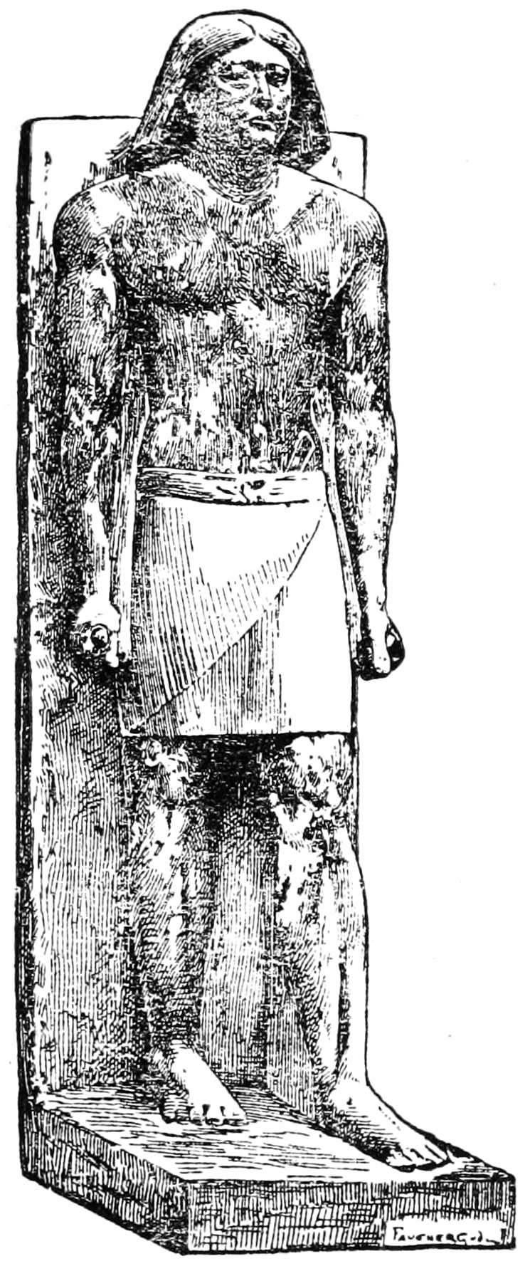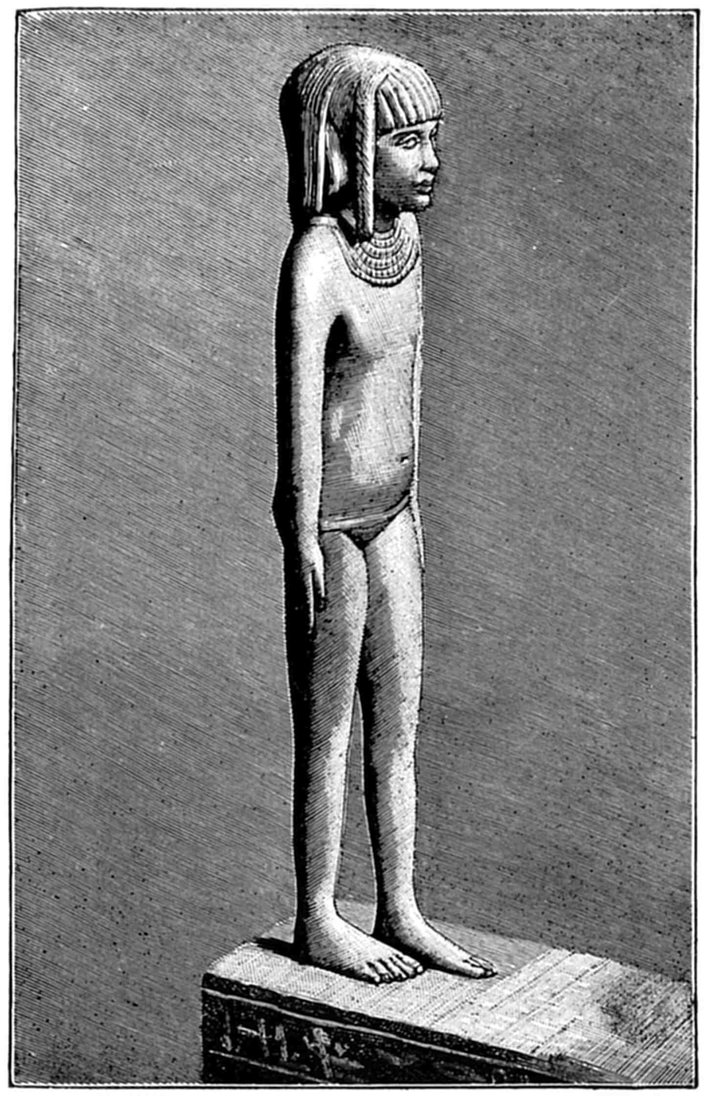 77 Champollion, “Notice descriptive des monuments égyptiens du Musée Charles X,” 1827, 8vo, describes the object as follows: “85. Hard wood. A woman named Naï, standing, dressed in a long fringed tunic, hair plaited. The statuette was dedicated by her brother, Phtah-Maï, auditor of justice,” pp. 68–9. Now the little figure is numbered 37; it is in case A of the “Salle civile” (first shelf).