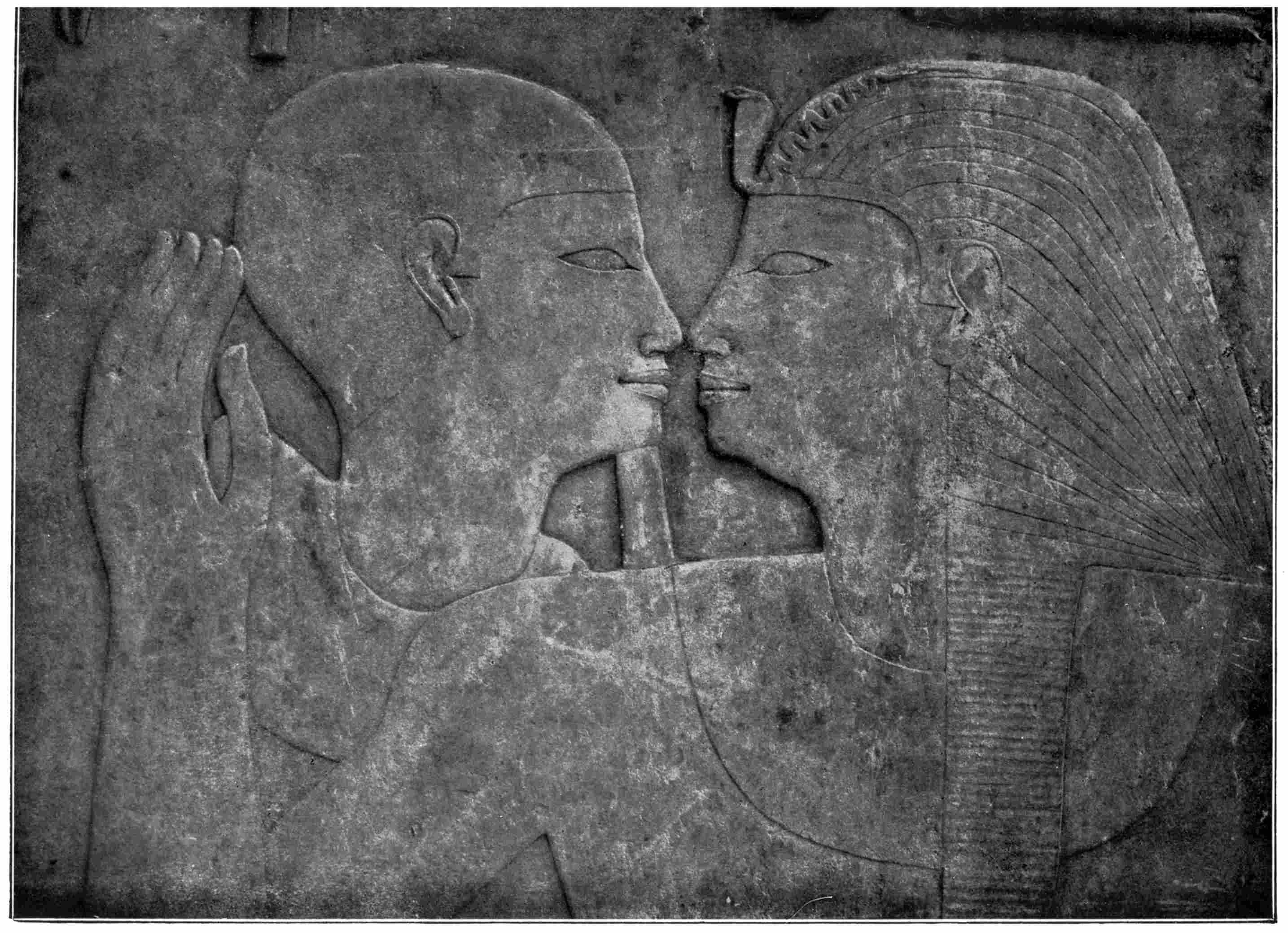 23 Here are some references to plates in Lepsius where the husband and wife are represented side by side in different positions. The woman of low stature crouches behind her seated husband (“Denkmäler,” ii., 71b); the wife and husband, both of heroic stature, are seated on the same armchair, and the wife puts her right arm round her husband’s neck (“Denkmäler,” ii., 10b, 24, 25b, 41b, 42a-b, 75a, etc.); the wife of low stature stands in front of her husband, who is of heroic stature (“Denkmäler,” ii., 38b); she stands behind him and puts her arm round his left arm (“Denkmäler,” ii., 27, 33a), or she puts her arm round his waist (“Denkmäler,” ii., 38a); and lastly, the husband and wife, of the same stature, are standing, the wife behind her husband and putting her arm round his neck (“Denkmäler,” ii., 13, 20–1, 29b, 32, 34b, 40b, 43b, 46, 58a, 59b), or separated from him (“Denkmäler,” ii., 73, etc.).
