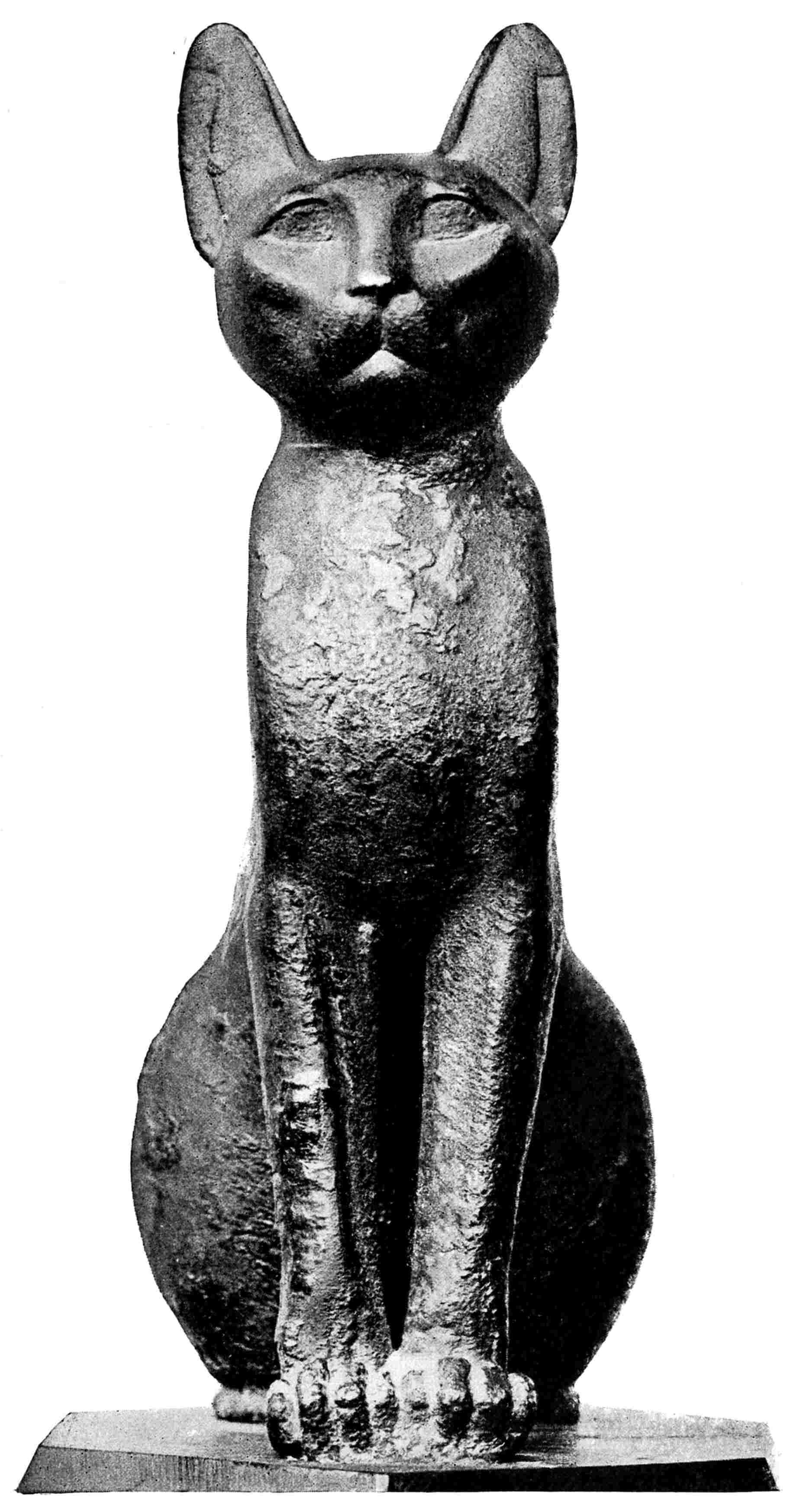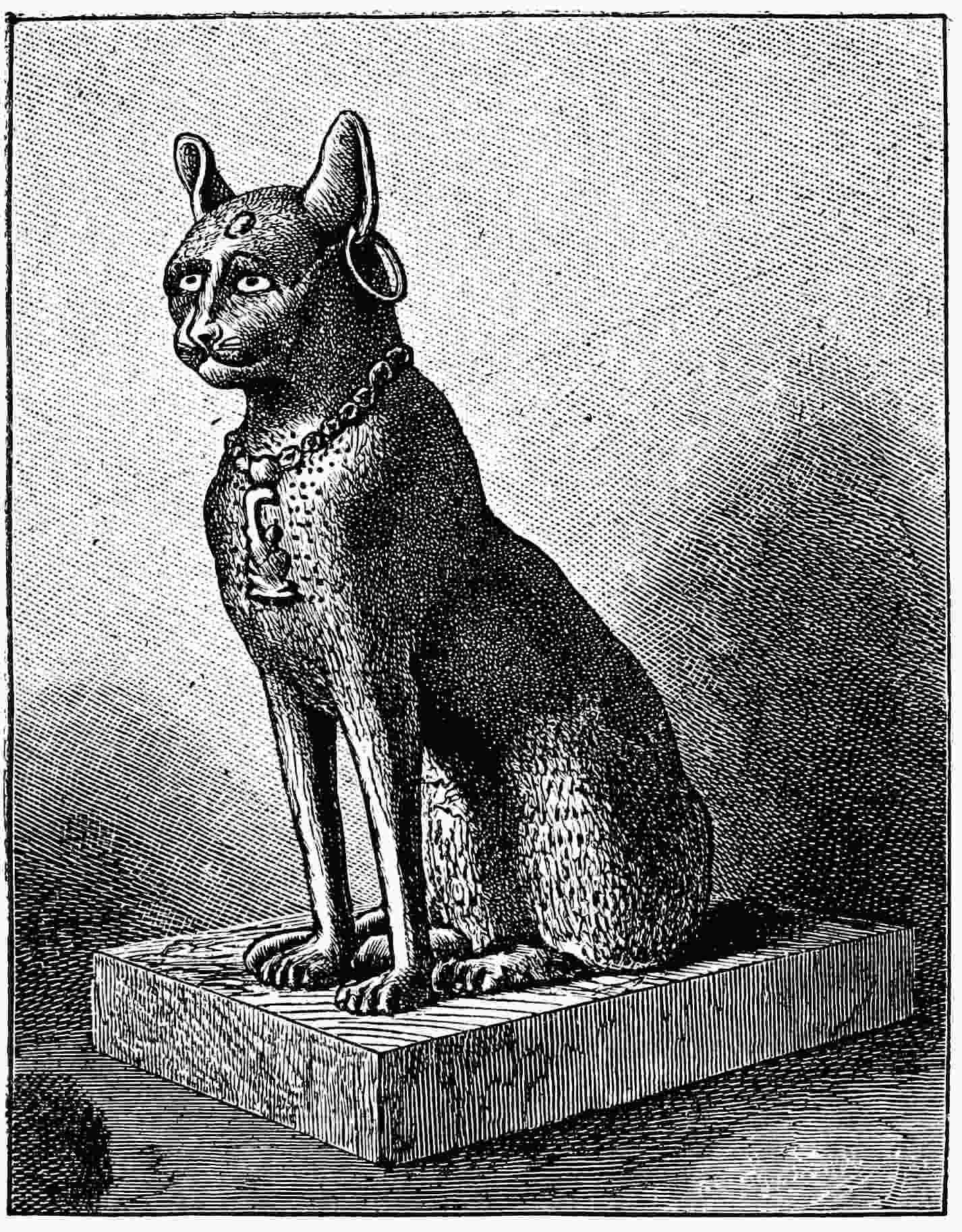 It was announced in the English newspapers, and the French followed suit, that a ship had recently reached London and disembarked 180,000 mummies of Egyptian cats. For a long time manufacturers of different nationalities have been accustomed to seek out the burying grounds of animals throughout Egypt, and to export the bones to Europe, where they are used as manure. A few years ago a necropolis full of monkeys was sent to Germany to manure beet-root fields. It seems that the cats of this year were discovered near Beni-Hassan; they were piled up at hazard in a sort of cavern, into which a fellah in search of antiquities was the first to penetrate. In fact, at some distance to the south of the hypogeums of Beni-Hassan, in the place called by geographers Speos-Artemidos, is a chapel hollowed out in the rock, and consecrated by the kings of the XVIIIth and XIXth Dynasties to a local goddess, a woman’s body with a cat’s or lion’s head, called Pakhît. The depôt recently exploited was found there, and the cats which reposed in it must have lived in the vicinity, under the protection of their cousin, the goddess. Cemeteries of the same kind existed wherever a divinity of a feline type was worshipped,215 lion, tiger, or cat. The most celebrated was at Bubastis, in the delta, where the seekers of antiquities cleared away the rubbish about thirty-seven years ago.95 The mummies of cats were buried there in favissæ, deep pits, some merely wrapped in swathings, others enclosed in little coffins reproducing the image of the animal. Some of these coffins are entirely of wood covered with white stucco, gilded, painted in bright colours; some are in bronze, others have the body in wood and the head in bronze, with gold rings in their ears and encrustations of gold on the forehead and in the eyes. Statuettes of cats of different sizes, portraits of the goddess Bastît with a cat’s head, or of the god Nofirtoumou, are mingled with the mummies. Thence come the thousands of bronze cats, big and little, with which all the antiquaries of Europe and Cairo were so abundantly provided from 1876 to 1888. The important cat illustrated here, and who lives now in one of the glass cases in the “Salle divine” of the Louvre, is a perfect type of the species, long, slender in the back, broad in the hind-quarters, with a delicate, well-set head, rings in the ears, a necklace round the neck, and a little scarab on the top of the head; the artist who modelled it has rendered excellently and truthfully the supple bearing and the bold physiognomy of his original.