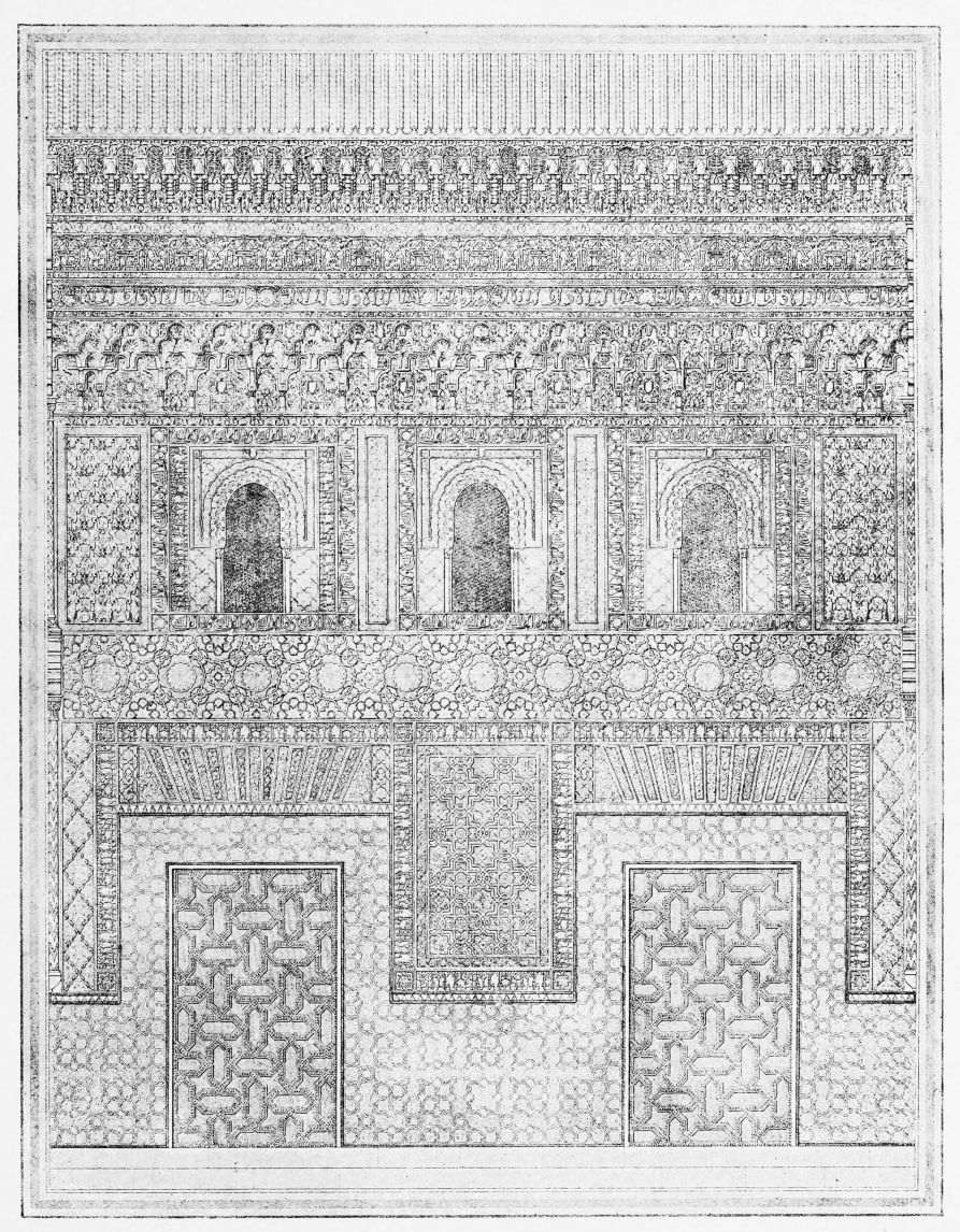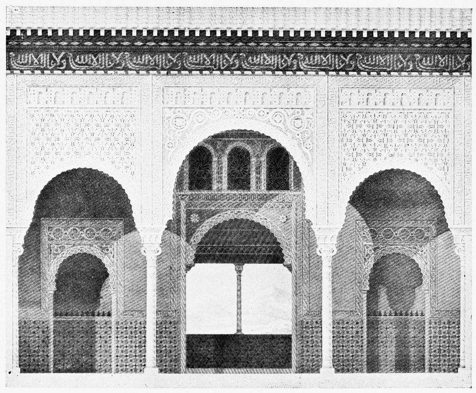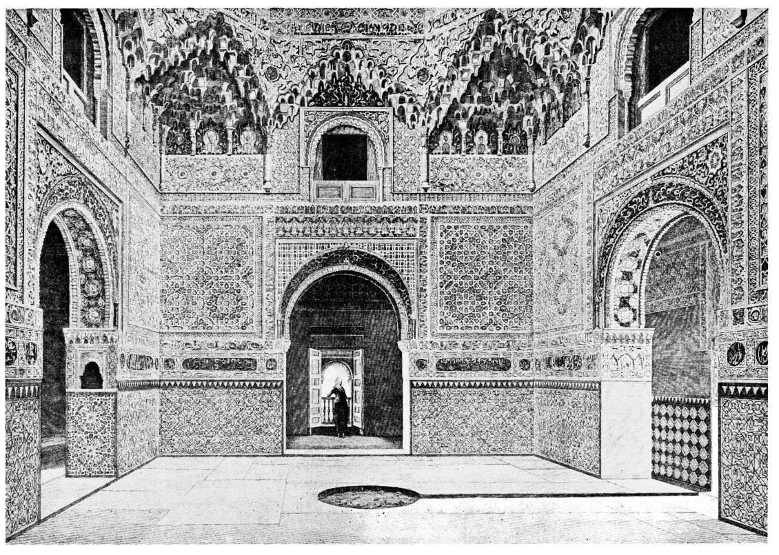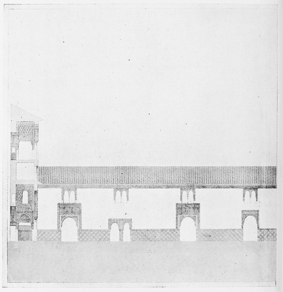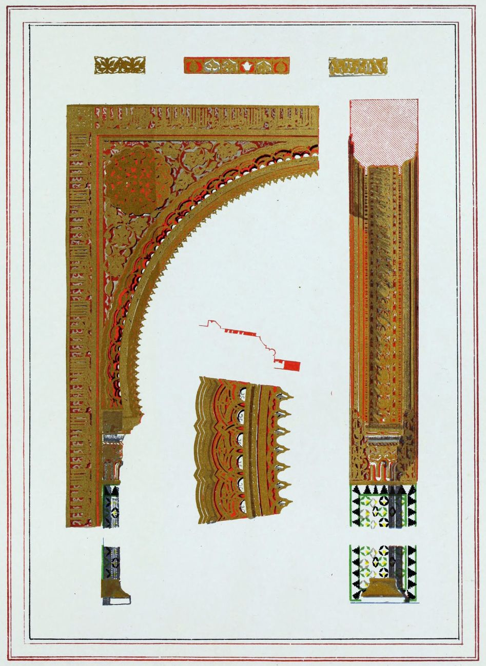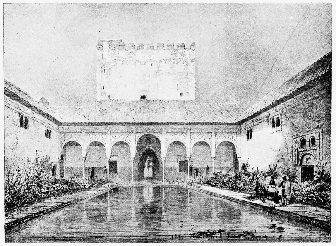 Don Mariano Contreras, Conservator of the Alhambra, the son of the gifted Raphaël Contreras, who devoted thirty-seven years of his life to the restoration of the Palace—gave me the benefit of his knowledge of this unique treasure-house of art; and I have also laid under contribution the beautiful plates of Owen Jones, who disposed of a Welsh inheritance in order to produce his great work on the Plans, Elevations, Sections and Details of the Alhambra. Jones’s Grammar of Ornament, which has been described as “beautiful enough to be the horn-book of the Angels,” also contains the result of his researches in the Alhambra, which occupied him for the greater part of eleven years. A selection of these illustrations is here rescued from the obscurity of public libraries and the inaccessible recesses of private collections. The inclusion of John F. Lewis’s drawings, and the reproduction of a series of pictures by James C. Murphy, who spent seven years in the study of the artistic marvels of the Alhambra, I do not feel called upon to defend. The photographs, several of which were placed at my disposal by Don Rafaël Garzón, represent the buildings as they appear to-day; the drawings were made before the Palace was damaged by the disastrous fire of September, 1890.{ix}