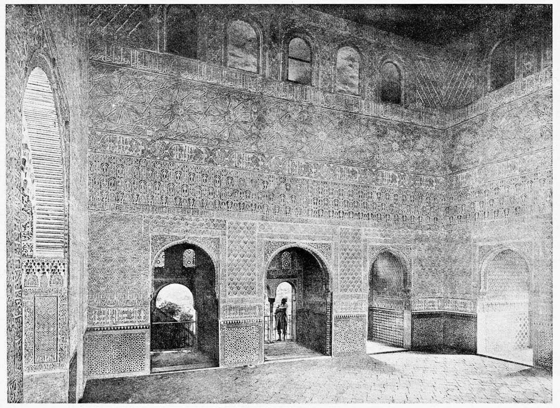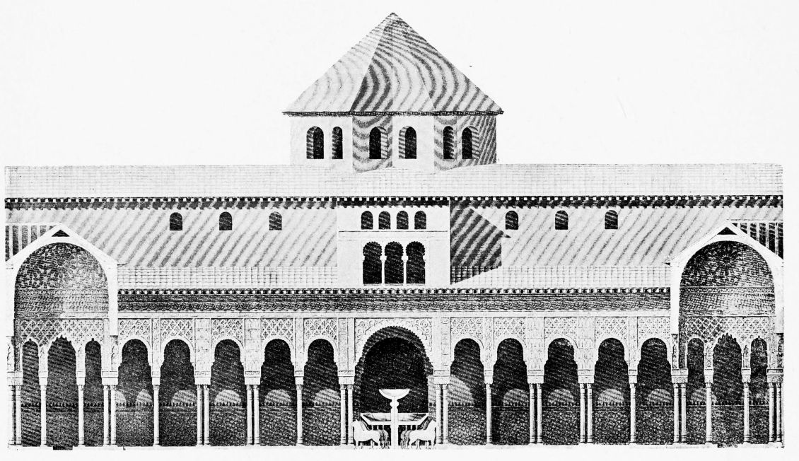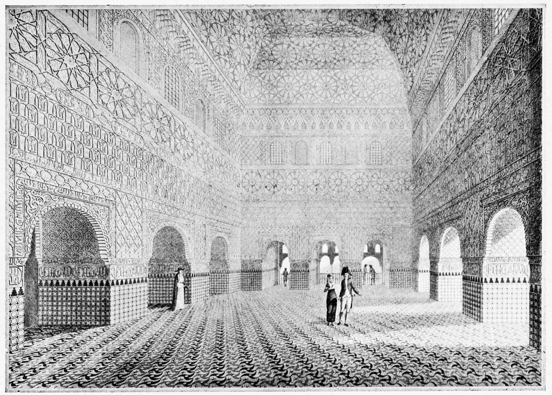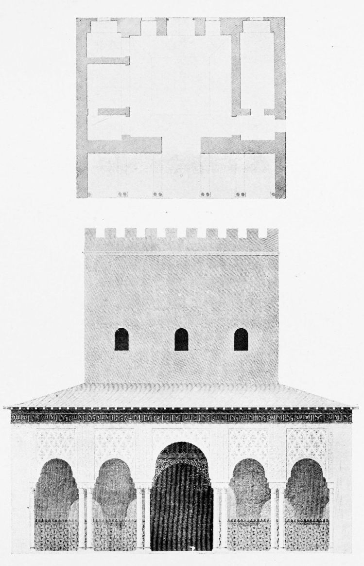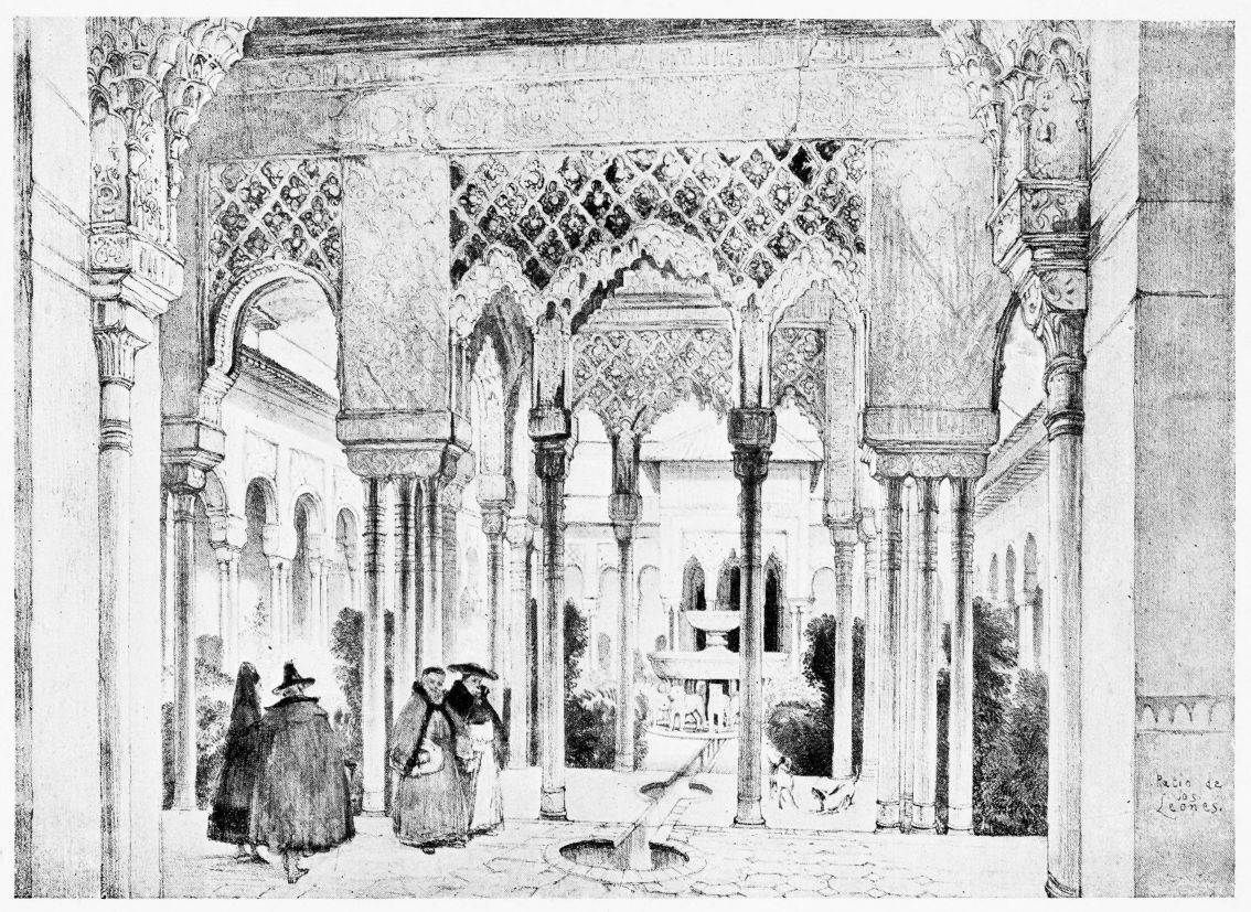 Don Mariano Contreras, Conservator of the Alhambra, the son of the gifted Raphaël Contreras, who devoted thirty-seven years of his life to the restoration of the Palace—gave me the benefit of his knowledge of this unique treasure-house of art; and I have also laid under contribution the beautiful plates of Owen Jones, who disposed of a Welsh inheritance in order to produce his great work on the Plans, Elevations, Sections and Details of the Alhambra. Jones’s Grammar of Ornament, which has been described as “beautiful enough to be the horn-book of the Angels,” also contains the result of his researches in the Alhambra, which occupied him for the greater part of eleven years. A selection of these illustrations is here rescued from the obscurity of public libraries and the inaccessible recesses of private collections. The inclusion of John F. Lewis’s drawings, and the reproduction of a series of pictures by James C. Murphy, who spent seven years in the study of the artistic marvels of the Alhambra, I do not feel called upon to defend. The photographs, several of which were placed at my disposal by Don Rafaël Garzón, represent the buildings as they appear to-day; the drawings were made before the Palace was damaged by the disastrous fire of September, 1890.{ix}