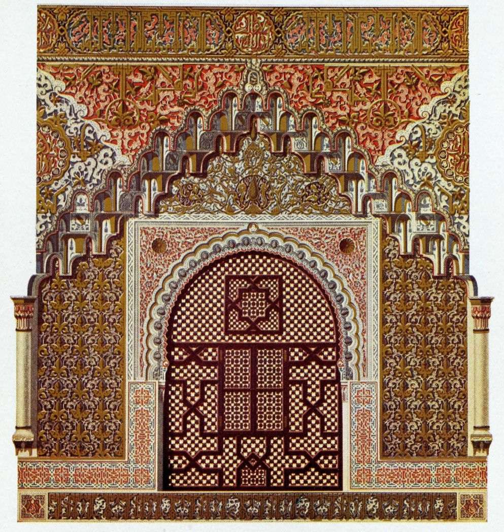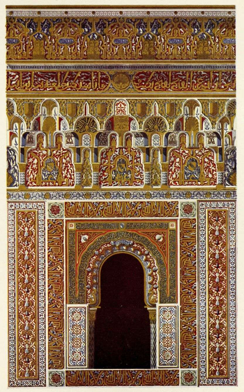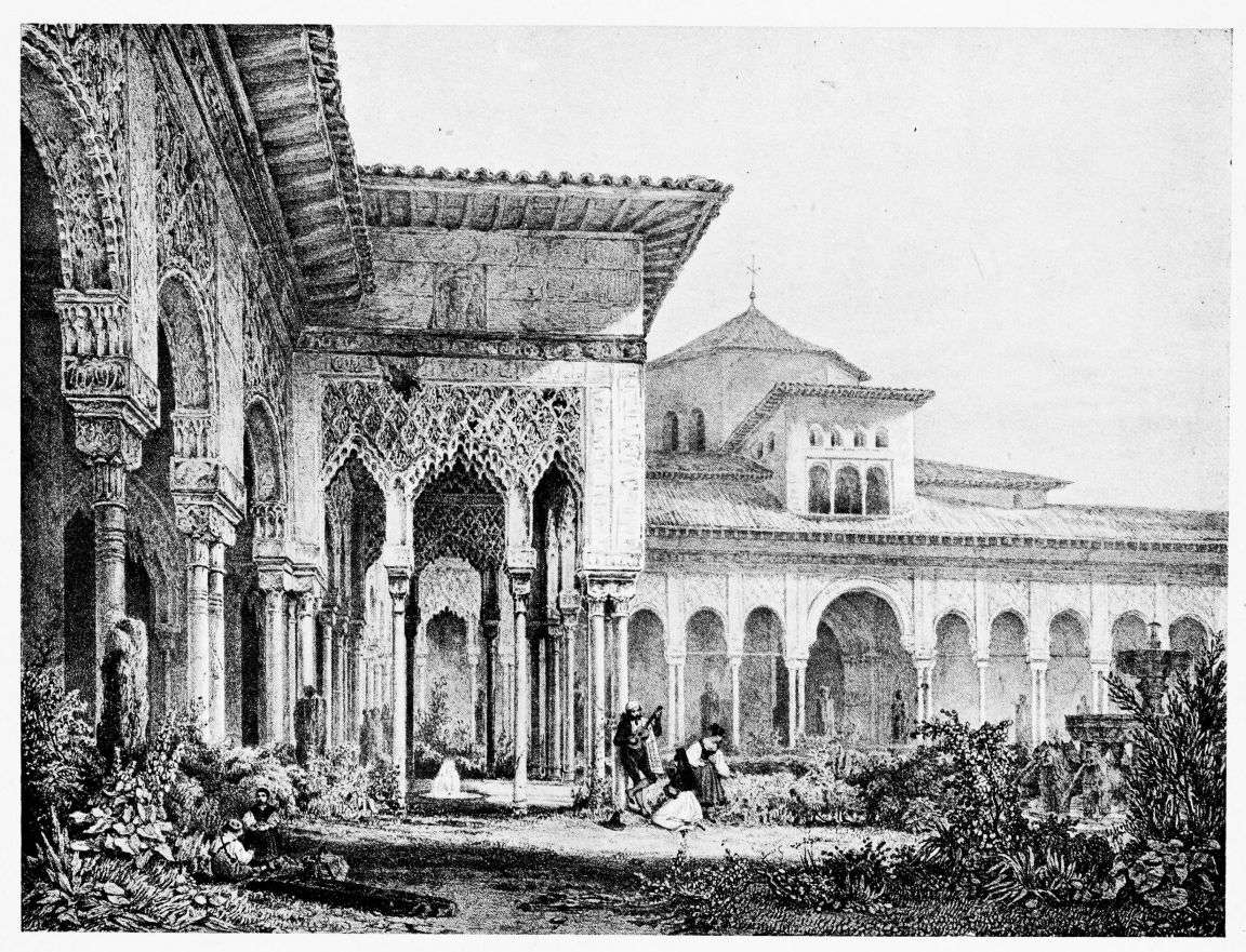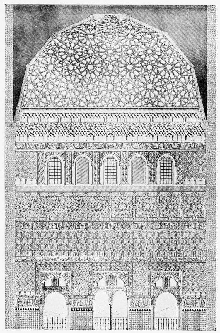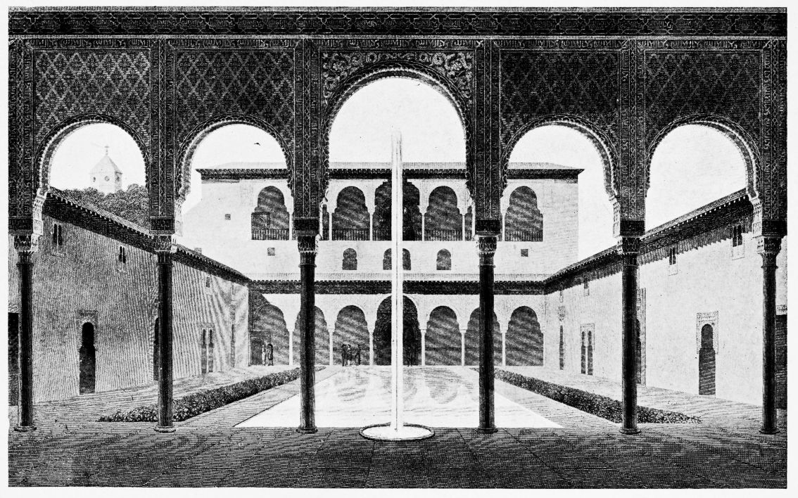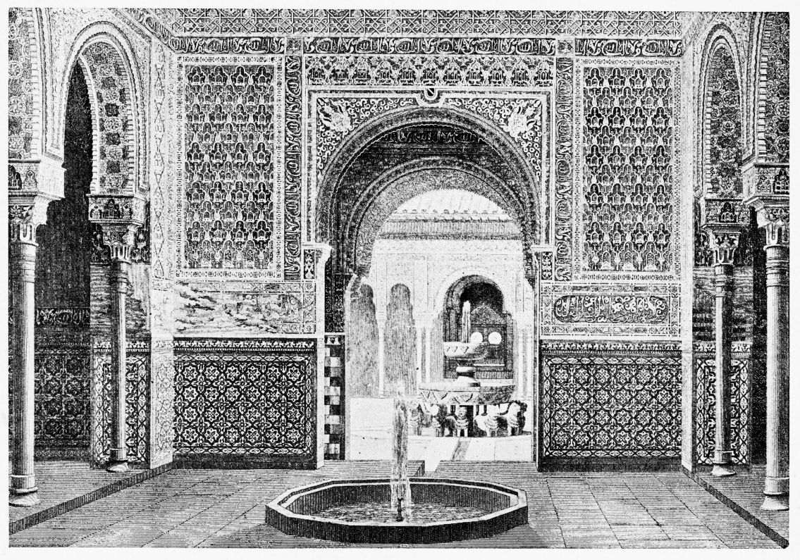 Don Mariano Contreras, Conservator of the Alhambra, the son of the gifted Raphaël Contreras, who devoted thirty-seven years of his life to the restoration of the Palace—gave me the benefit of his knowledge of this unique treasure-house of art; and I have also laid under contribution the beautiful plates of Owen Jones, who disposed of a Welsh inheritance in order to produce his great work on the Plans, Elevations, Sections and Details of the Alhambra. Jones’s Grammar of Ornament, which has been described as “beautiful enough to be the horn-book of the Angels,” also contains the result of his researches in the Alhambra, which occupied him for the greater part of eleven years. A selection of these illustrations is here rescued from the obscurity of public libraries and the inaccessible recesses of private collections. The inclusion of John F. Lewis’s drawings, and the reproduction of a series of pictures by James C. Murphy, who spent seven years in the study of the artistic marvels of the Alhambra, I do not feel called upon to defend. The photographs, several of which were placed at my disposal by Don Rafaël Garzón, represent the buildings as they appear to-day; the drawings were made before the Palace was damaged by the disastrous fire of September, 1890.{ix}