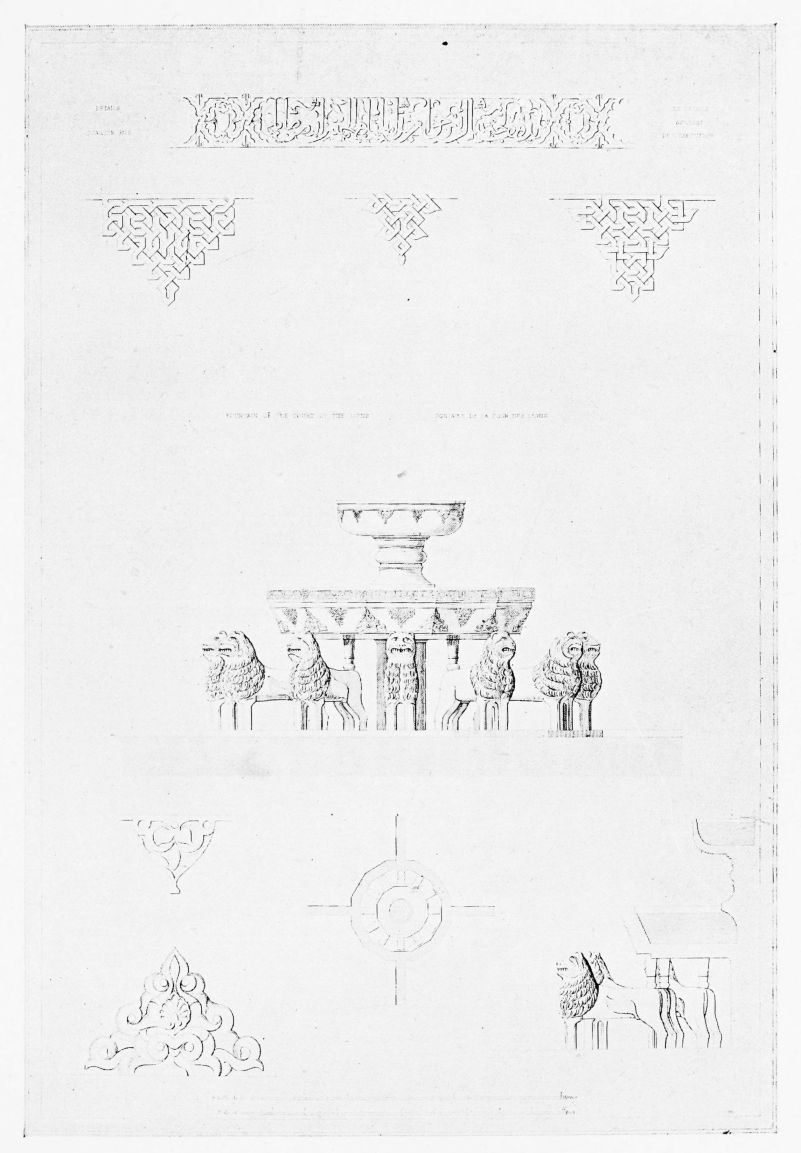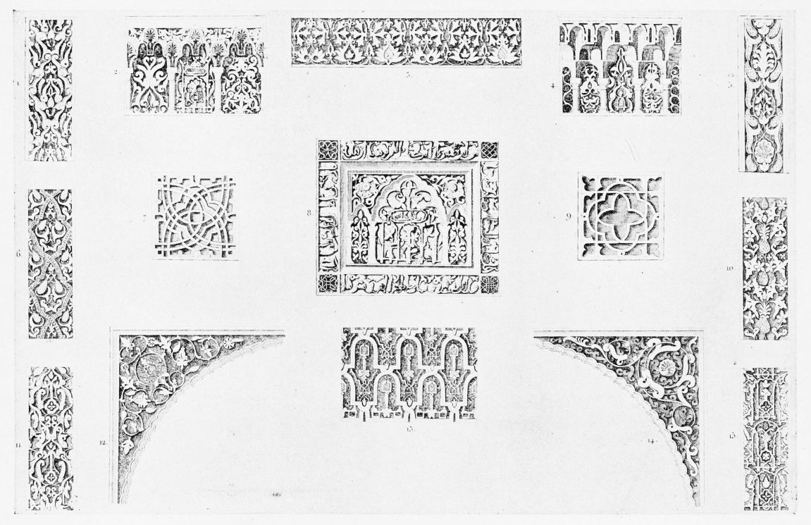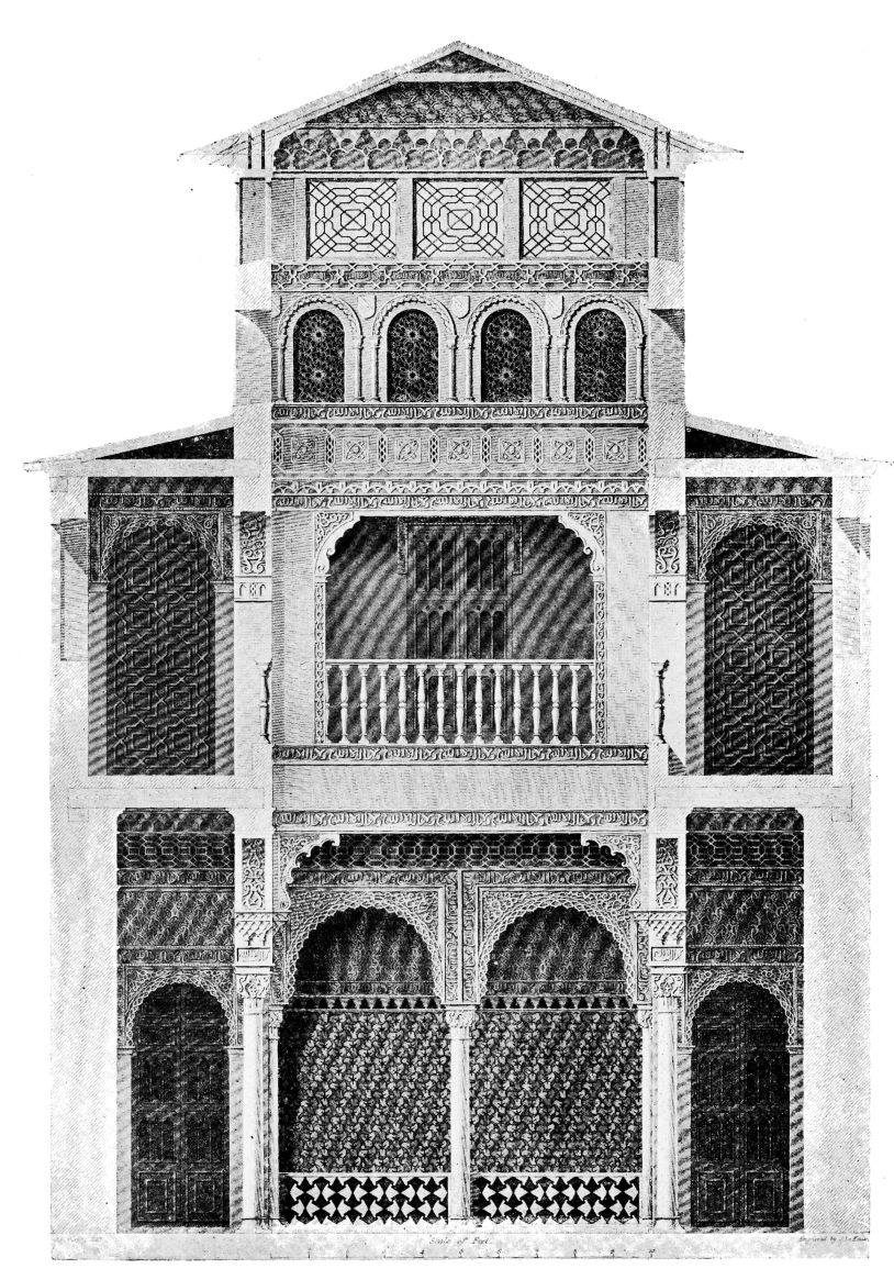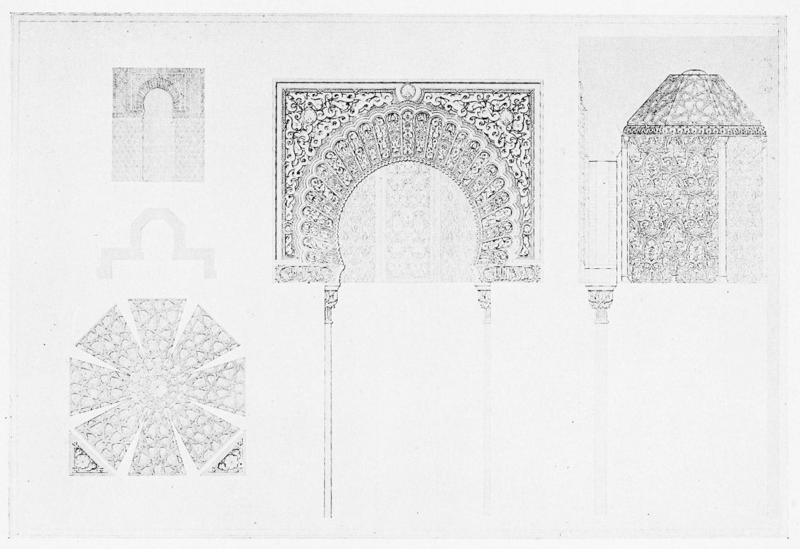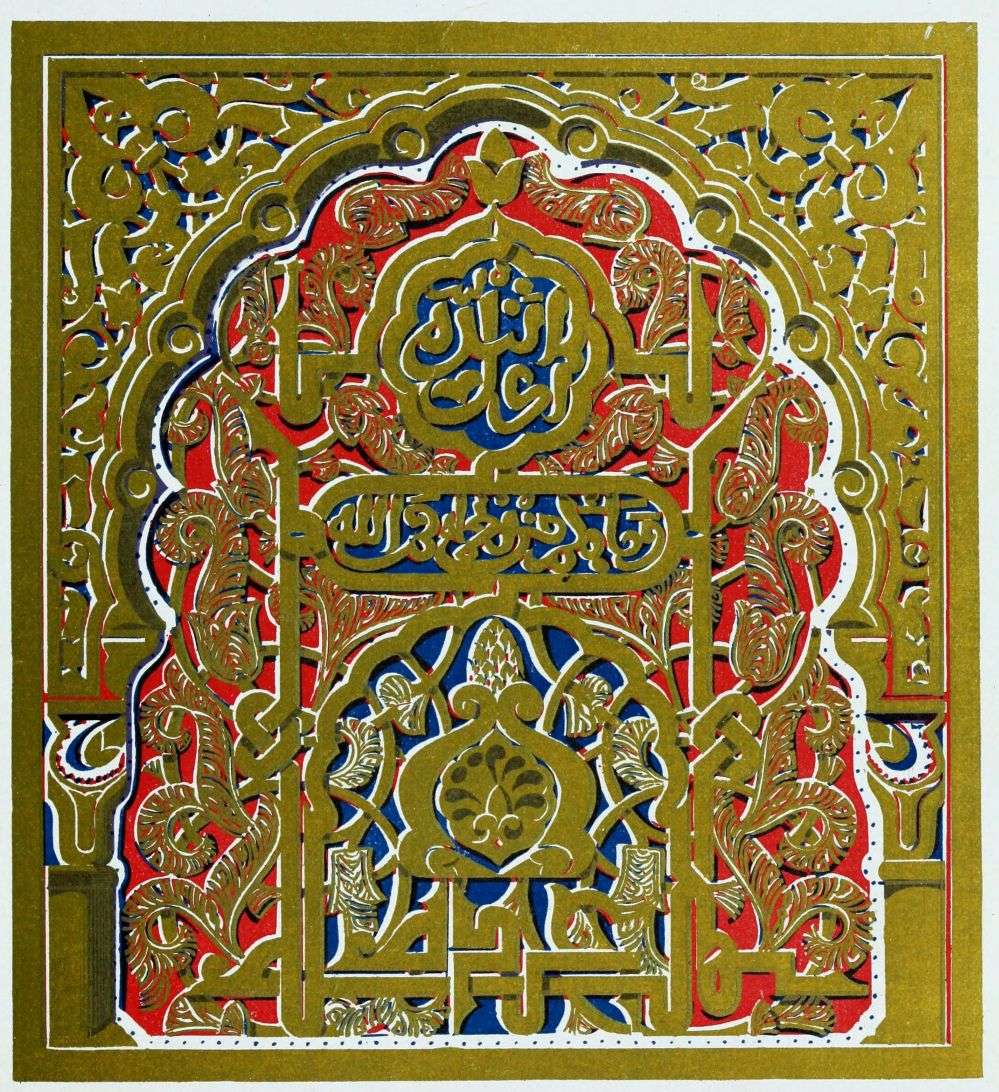[9] Edited by Pablo Lozano. The antiquities and history of the Moorish domination in Spain remained unheeded until representations were made that research and accurate delineation would alone make their monuments intelligible. The Royal Academy of St. Ferdinand was commissioned to make drawings of the Palace of the Alhambra and of the Mosque of Córdova. The result of their labours were published at Madrid, in 1780, in a folio volume entitled as above, with sixteen plates of Arabic designs, accompanied by a few pages of letterpress. It is an exceedingly rare volume.