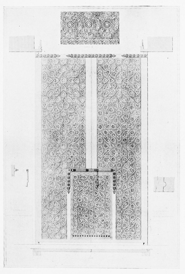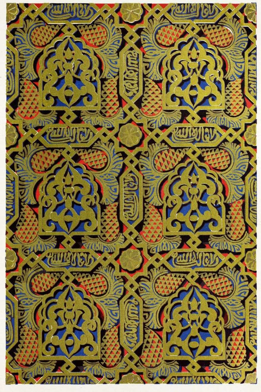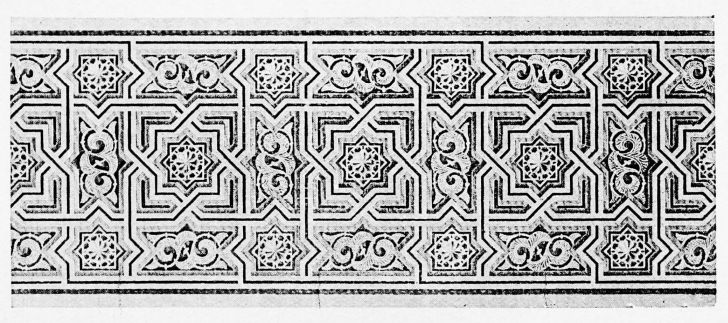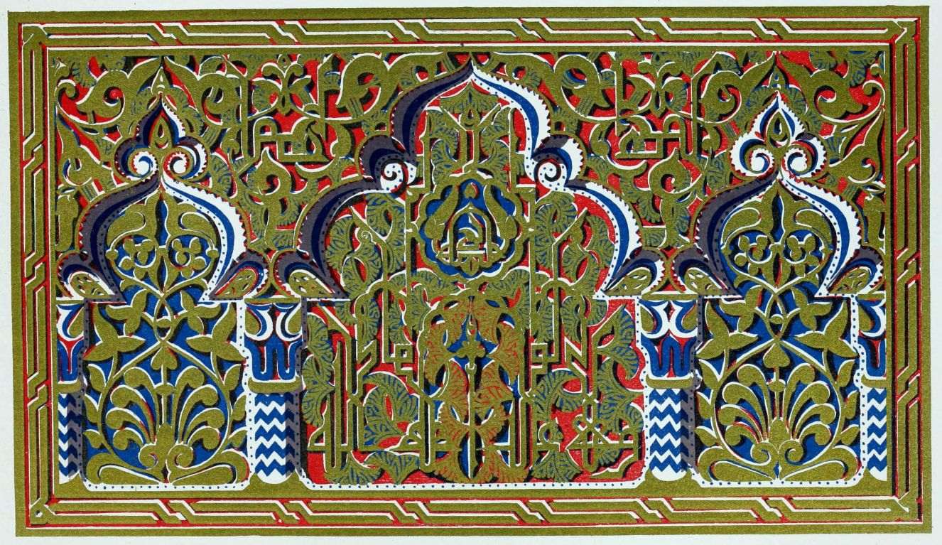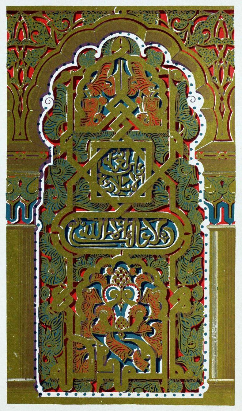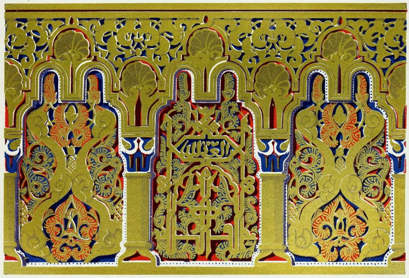 [9] Edited by Pablo Lozano. The antiquities and history of the Moorish domination in Spain remained unheeded until representations were made that research and accurate delineation would alone make their monuments intelligible. The Royal Academy of St. Ferdinand was commissioned to make drawings of the Palace of the Alhambra and of the Mosque of Córdova. The result of their labours were published at Madrid, in 1780, in a folio volume entitled as above, with sixteen plates of Arabic designs, accompanied by a few pages of letterpress. It is an exceedingly rare volume.