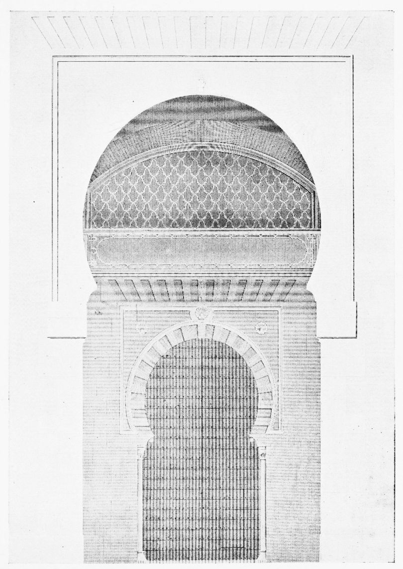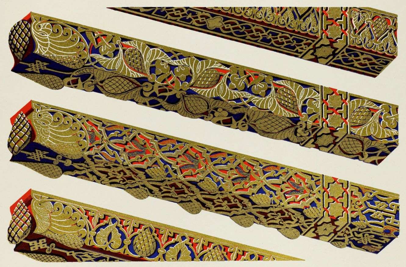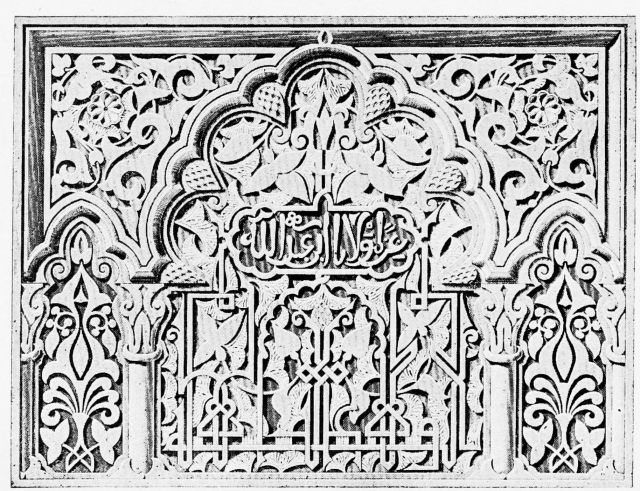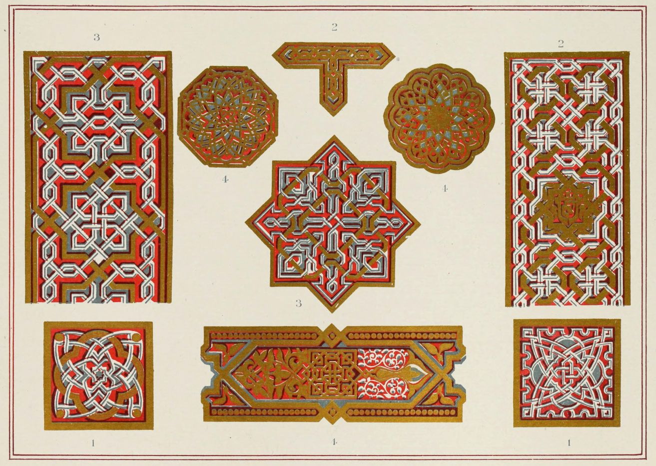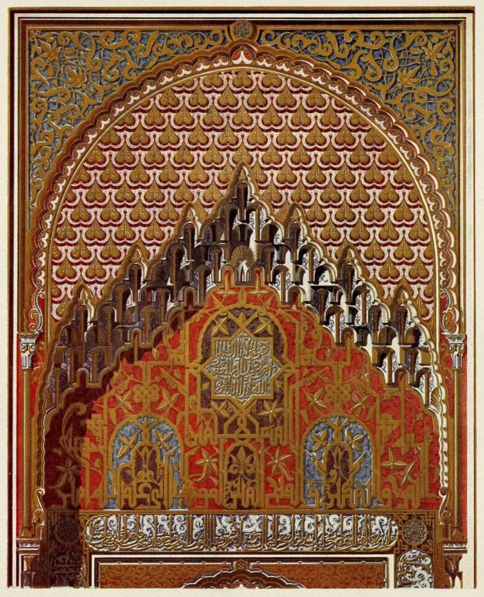 [9] Edited by Pablo Lozano. The antiquities and history of the Moorish domination in Spain remained unheeded until representations were made that research and accurate delineation would alone make their monuments intelligible. The Royal Academy of St. Ferdinand was commissioned to make drawings of the Palace of the Alhambra and of the Mosque of Córdova. The result of their labours were published at Madrid, in 1780, in a folio volume entitled as above, with sixteen plates of Arabic designs, accompanied by a few pages of letterpress. It is an exceedingly rare volume.