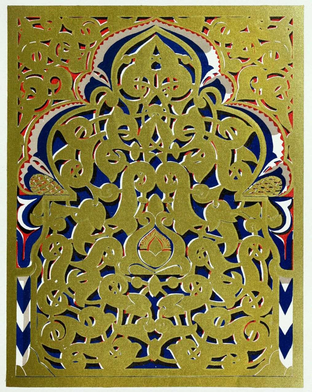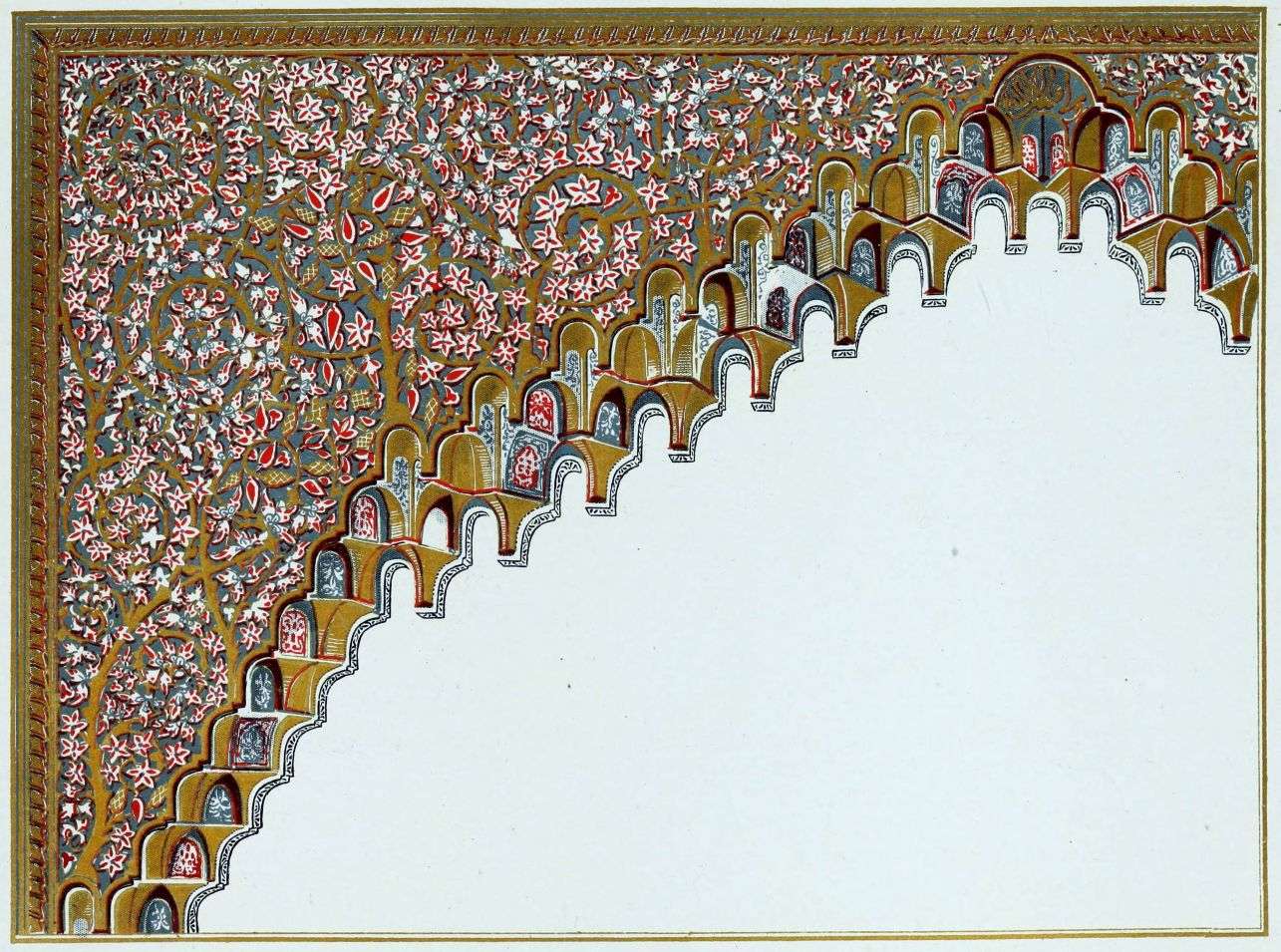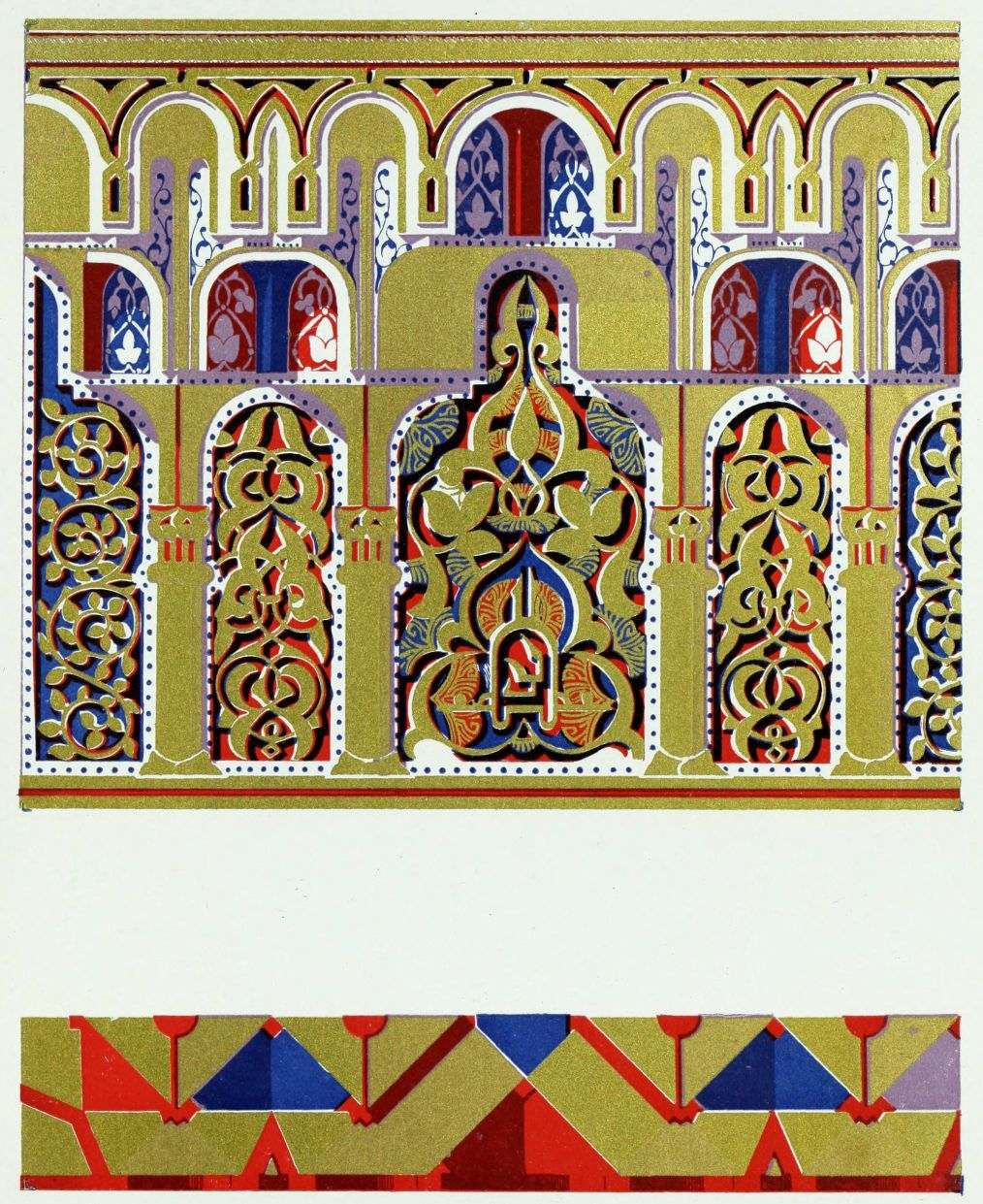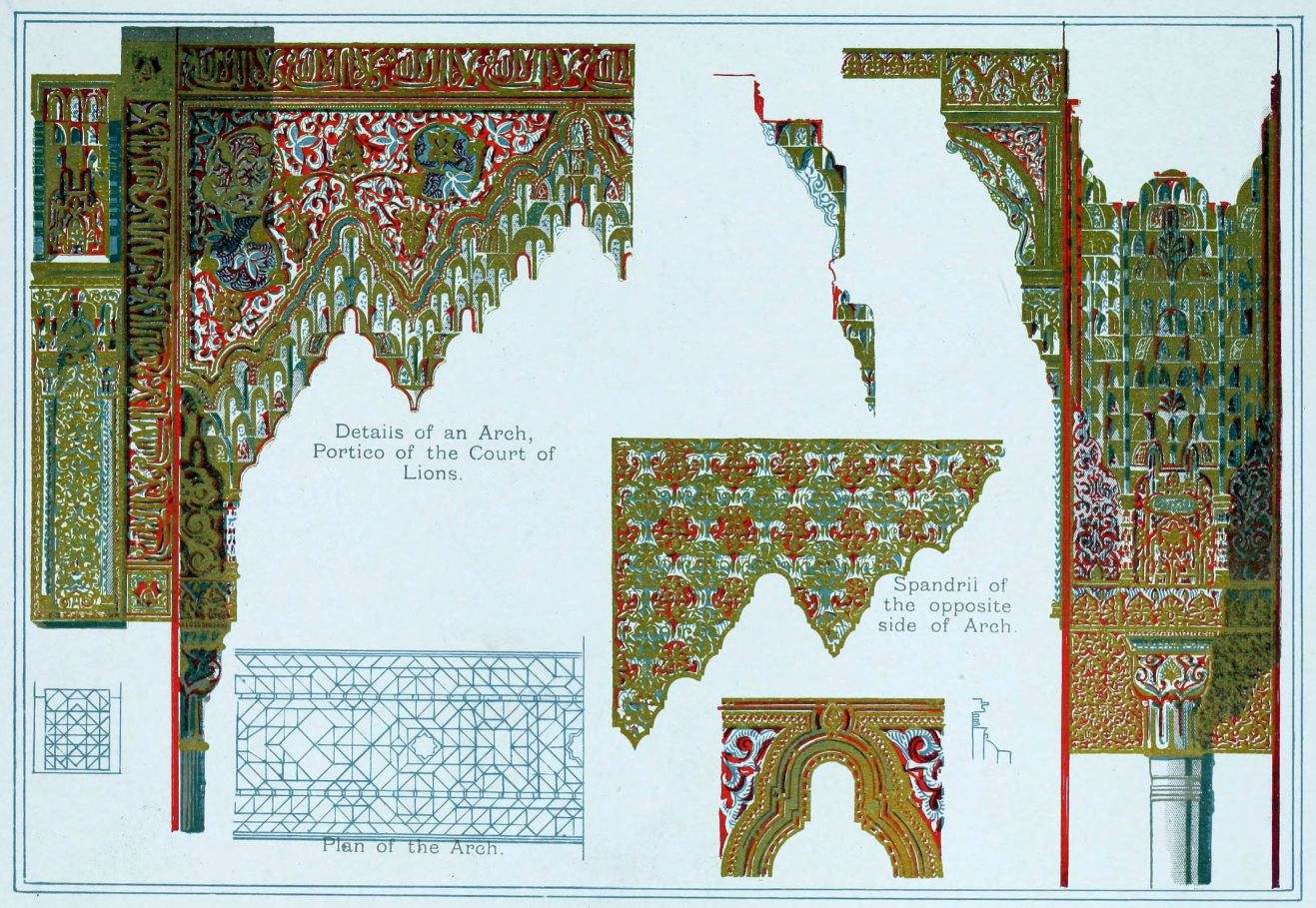 [9] Edited by Pablo Lozano. The antiquities and history of the Moorish domination in Spain remained unheeded until representations were made that research and accurate delineation would alone make their monuments intelligible. The Royal Academy of St. Ferdinand was commissioned to make drawings of the Palace of the Alhambra and of the Mosque of Córdova. The result of their labours were published at Madrid, in 1780, in a folio volume entitled as above, with sixteen plates of Arabic designs, accompanied by a few pages of letterpress. It is an exceedingly rare volume.