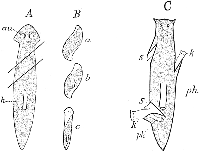 Budding and division—Every theory of regeneration in the meantime only provisional, a mere 'portmanteau theory'—Regeneration not a primary character—Volvox—Hydra—Vital affinities—Planarians—Heteromorphoses—Enemies of Hydroid-colonies—Regeneration in Plants—In Amphibians—In Earthworms—Different degrees of regenerative capacity according to the liability of the part to injury—Different results of longitudinal halving in Earthworms and in Planarians—Regeneration in Birds—The disappearance of the power of regeneration is very slow—Morgan's experiments on Hermit-crabs—Autotomy in Crustaceans and Insects—Regeneration of the lens in Triton.