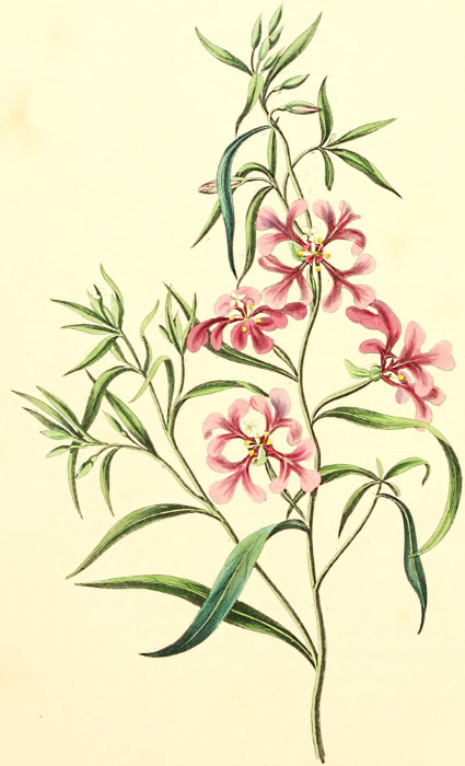 Root fibrous, stem prostrate, branching—leaves opposite, sessile, oblong, ovate, margins deeply serrate, hairy on both sides—flowers terminal, corymbose—calyx campanulate, five cleft—corolla very bright crimson, tubular, limb spreading, five segments, obtuse emarginate—throat white, hairy—stamens four, two long, two short, inserted in the tube of the corolla—anthers two lobed, style one, smooth, stigma bifid, germen smooth.