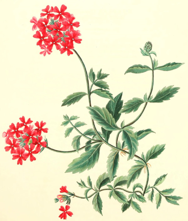 The unrivalled brilliancy of the colour of this beautiful species of Verbena, renders it a most ornamental plant for the front of the flower borders, and when grown in large patches it is almost impossible to give an idea of the dazzling splendour of its appearance; it is a plant of the easiest cultivation, and if allowed to grow according to its natural habit, which is prostrate, it will propagate itself by the radicles which are produced at the different joints, and by this means will attach itself to the ground; the plants thus rooted may be removed any time. A brown loamy soil, a good deal of moisture, and a sheltered situation are necessary, and as it is doubtful how it may bear the severity of our winters, it is the safest method to keep some plants in a frame, during severe frosts, which will flower early in the ensuing spring. It is a native of Paraguay and Buenos Ayres, and was introduced into this country about 1827. There are only two other species worth cultivating in the flower garden.