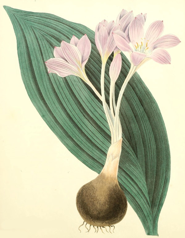 Root bulbous, very large—scape radical, many flowered—corolla lilac pink—tube long, petals six, ob-ovate, spreading, strongly nerved at the back of each petal, tipped with a deeper color—stamens six, three longer than the others—filaments inserted in the base of the petals—anthers bright yellow—styles three, longer than the stamens—leaves radical, very large, broadly lanceolate, plicate, smooth, appearing after the flowers decay.