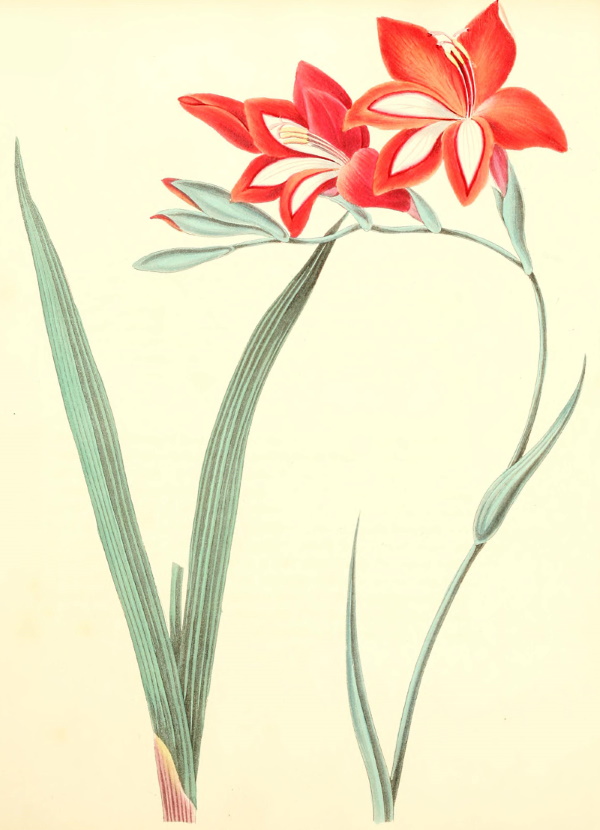 It is almost impossible to give an adequate representation of the brilliant colour of this beautiful species of Gladiolus, which was introduced into this country from Holland, about the year 1789, by the gardener to the King of Naples: though generally considered a tender plant, it will be found to grow well out of doors, in a southern aspect and sheltered situation, only requiring protection in the winter to keep the roots from severe frosts. Many of the bulbs from the Cape of Good Hope, of which place this is a native, may be grown well with care and attention in the open air, and make a beautiful addition to the flower garden in the summer months. The bulbs should be planted six or eight inches deep in a rich sandy soil, in a south aspect, where they will grow strong and flower freely. The hardiest species are