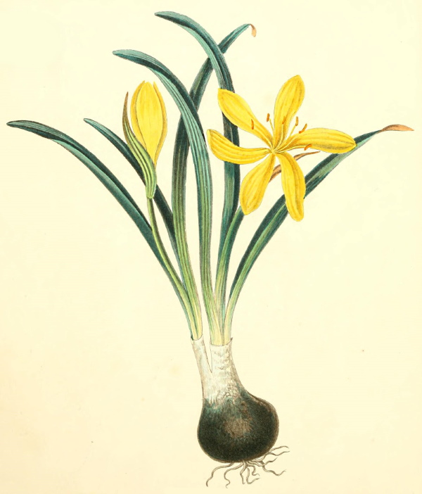 This plant, formerly known as Amaryllis lutea, is a native of the South of Europe, and various parts of the East. Though introduced into this country as early as 1596, it is by no means common. When planted in the front of the borders it is very ornamental, particularly when exposed to a bright sun, which causes the flowers to expand. It has acquired a more interesting character, from the supposition entertained by the late Sir J. E. Smith, that it may possibly be the Lily of Scripture, to which we find such beautiful allusions in the Sacred writings. Sir J. E. S. observes, "It is natural to presume the Divine Teacher, according to his usual custom, called the attention of his hearers to some object at hand; and, as the fields of the Levant are overrun with the Amaryllis lutea, whose golden liliaceous flowers in Autumn afford one of the most brilliant and gorgeous objects in nature, the expression of 'Solomon, in all his glory, not being arrayed like one of these,' is peculiarly appropriate." It is a plant of easy cultivation, perfectly hardy, and will grow in any good garden soil. At present there are few species of this genus.