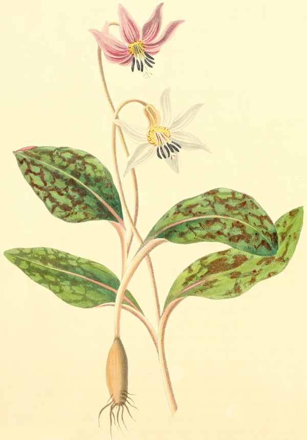 There are few plants more desirable for a flower garden than the Erythronium dens canis, and its white variety; and none contribute more to the beauty of our borders in the month of March, or beginning of April. It is a native of Hungary, and some parts of Italy, and was introduced into this country in the year 1596. These plants like a light soil, mixed with bog, and are propagated by offsets, which may be removed any time after the leaves decay; but the roots should not be kept long out of the ground, as they are liable to shrink. Miller mentions two species of the lilac Erythronium; but his distinctions, founded only on the breadth of the leaves, and colour of the flower, would not be sufficient to form a different species. It is, however, worthy of remark, that the leaves of those bulbs which do not bear flowers, are broader and rounder than the others. There are two other species, mentioned by Pursh, in his "Flora of North America," vol. i. p. 230, both bearing yellow flowers, one of which is occasionally seen in our gardens.—Erythronium Americanum.
