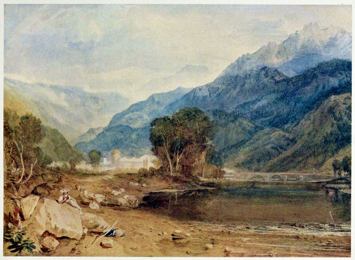 Made from sketches executed during Turner’s first visit to Switzerland in 1802. The snow-capped mountains in the distance no doubt belong to the chain of Mont Blanc.