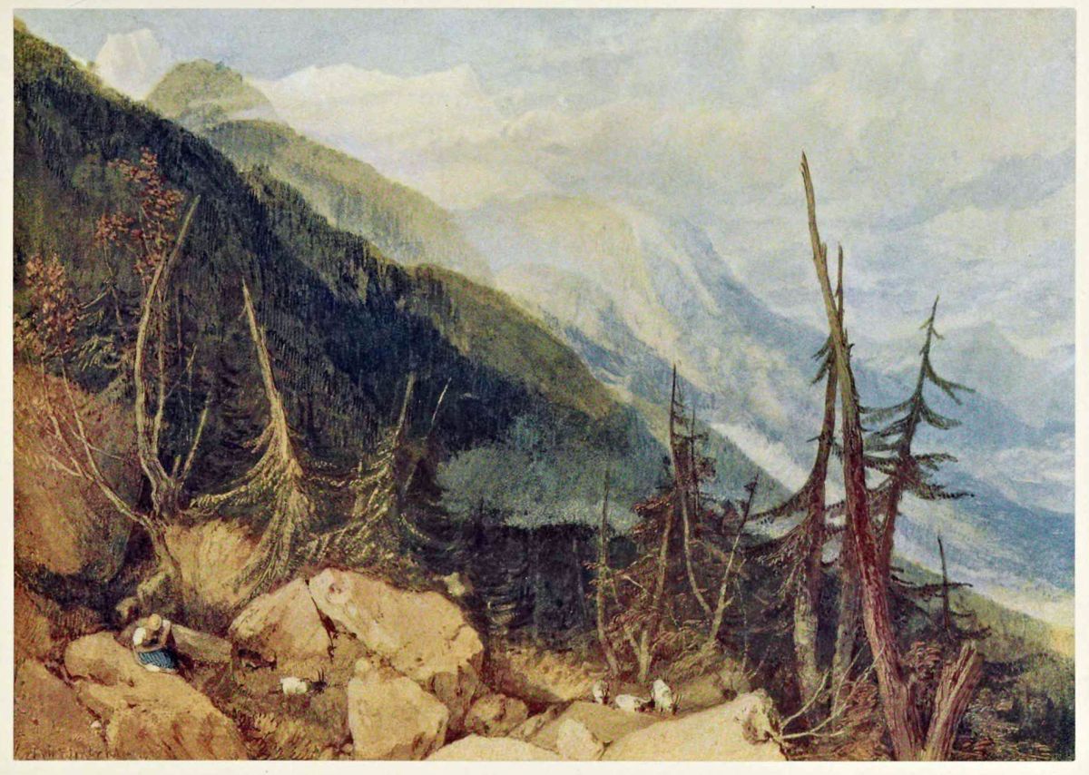 The first certain piece of evidence connecting Mr. Fawkes with Turner is contained in some of the sketch-books used by the artist during his first tour in Switzerland in the year 1802. Mr. Fawkes’s name is not mentioned in full, but a capital “F” is written in ink on the margin or back of several of the drawings. I take this to mean that a patron whose name began with “F” had looked through Turner’s sketch-books at some time after his return to London, and had selected certain subjects to be carried out from sketches thus marked. That this patron was Mr. Fawkes is established by the drawing made at Chamounix, which is inscribed in Turner’s handwriting “Mer de Glace, avec le Cabin de Blair” (page 22 of the “St. Gothard and Mont Blanc” Sketch-Book in the National Gallery). The finished water-colour now in the Farnley Hall Collection, entitled Blair’s Hut on the Montanvert and Mer de Glace, is simply an amplification of this sketch. Other subjects in these sketch-books which Turner carried out for Mr. Fawkes are Bonneville, Sallanches, The Falls of the Reichenbach, The Valley of Chamounix, The Fall of the Staubbach, The Lake of Lucerne from Flüelen, The Lake of Brienz with the Ruins of the Castle of Ringgenberg, and Grenoble.