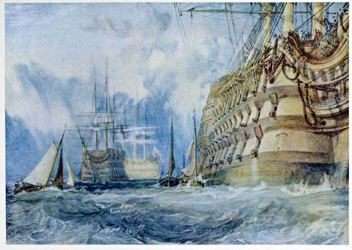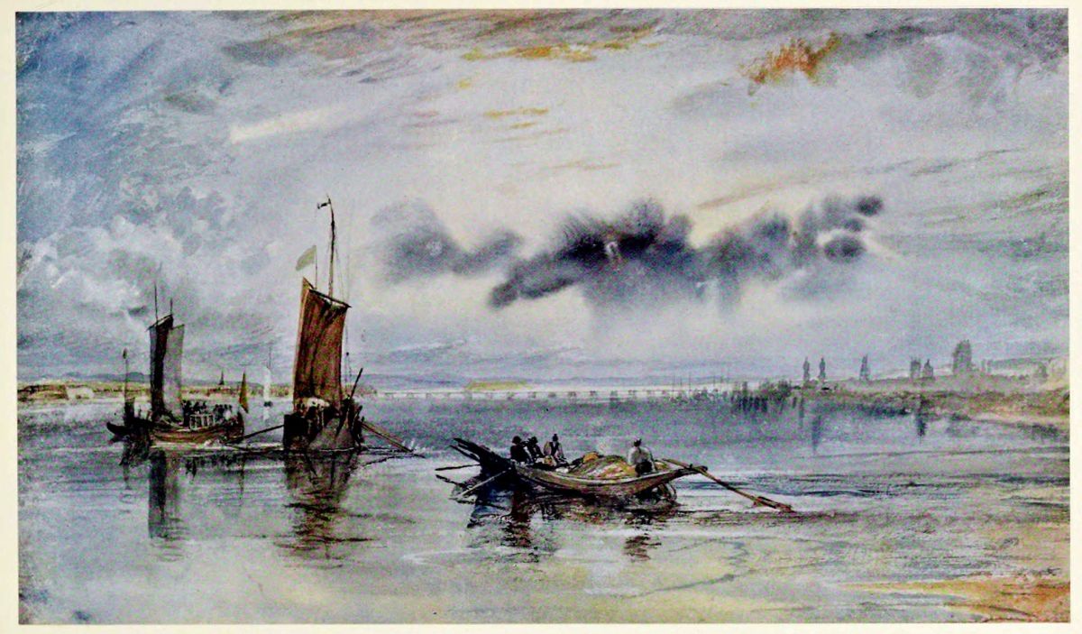 This is the drawing Turner is said to have begun and finished one morning at Farnley, between breakfast and lunch. There had been some talk at breakfast between Mr. Fawkes and Turner about the relative sizes of small sailing-craft and men-of-war. After breakfast, Turner said to young Hawksworth Fawkes that he would make a drawing to illustrate what they had been talking about. The boy sat beside him for three hours while the drawing was being made, the artist, says Thornbury, “tearing up the sea with the eagle-claw of his thumbnail, and working like a madman; yet the detail is full and delicate, betraying no sign of hurry.” This story has been frequently repeated, but it is hard, with the exquisitely finished and elaborate drawing in front of one, to accept it without considerable reservation.