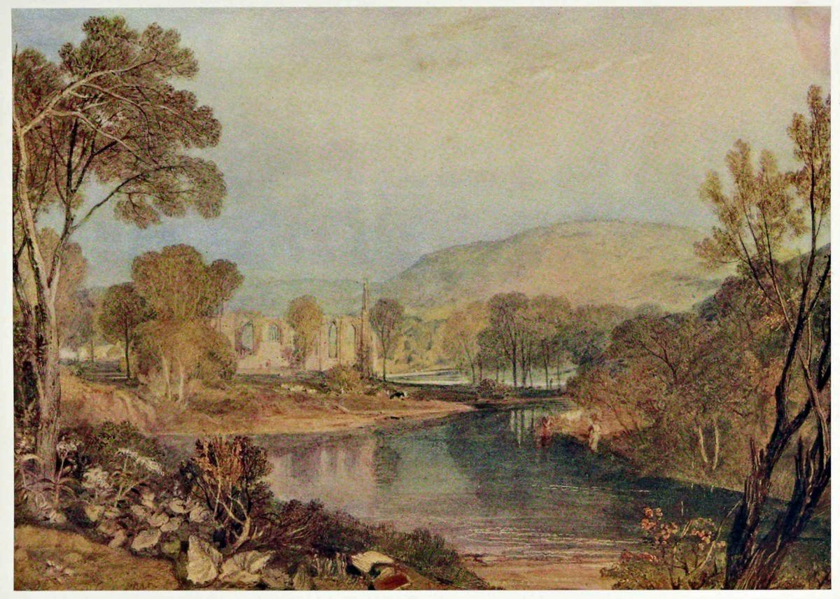 In 1814 Turner was, I believe, too busy sketching the southern coast from Hastings to Margate, and his “Views in Sussex”, to have much time for any lengthy visit to Farnley. But he was certainly there in 1815, as a passage in a letter to the Rev. H. Scott Trimmer proves. The letter is given in full in Monkhouse’s “Turner” (p. 90). It is dated “Tuesday, Aug. 1, 1815.” In it Turner says: “After next Tuesday—if you have a moment’s time to spare, a line will reach me at Farnley Hall, near Otley, Yorkshire, and for some time, as Mr. Fawkes talks of keeping me in the north by a trip to the Lakes, &c., until November.” The evidence of the sketch-books suggests that this trip to the Lakes did not take place.
