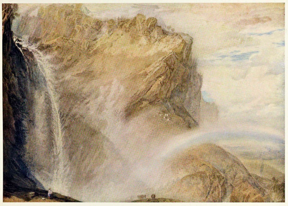 The white line of the falls is seen on the left in shadow, contrasting with the warm sunlight on the rock in the centre of design. The rainbow on the right is formed by the spray of the falls. In foreground, on left, just below the falls, are a peasant girl and dog (the white dress of the girl and the white dog are dug out with the penknife). An exquisitely delicate drawing, full of subtleties of form and colour.
