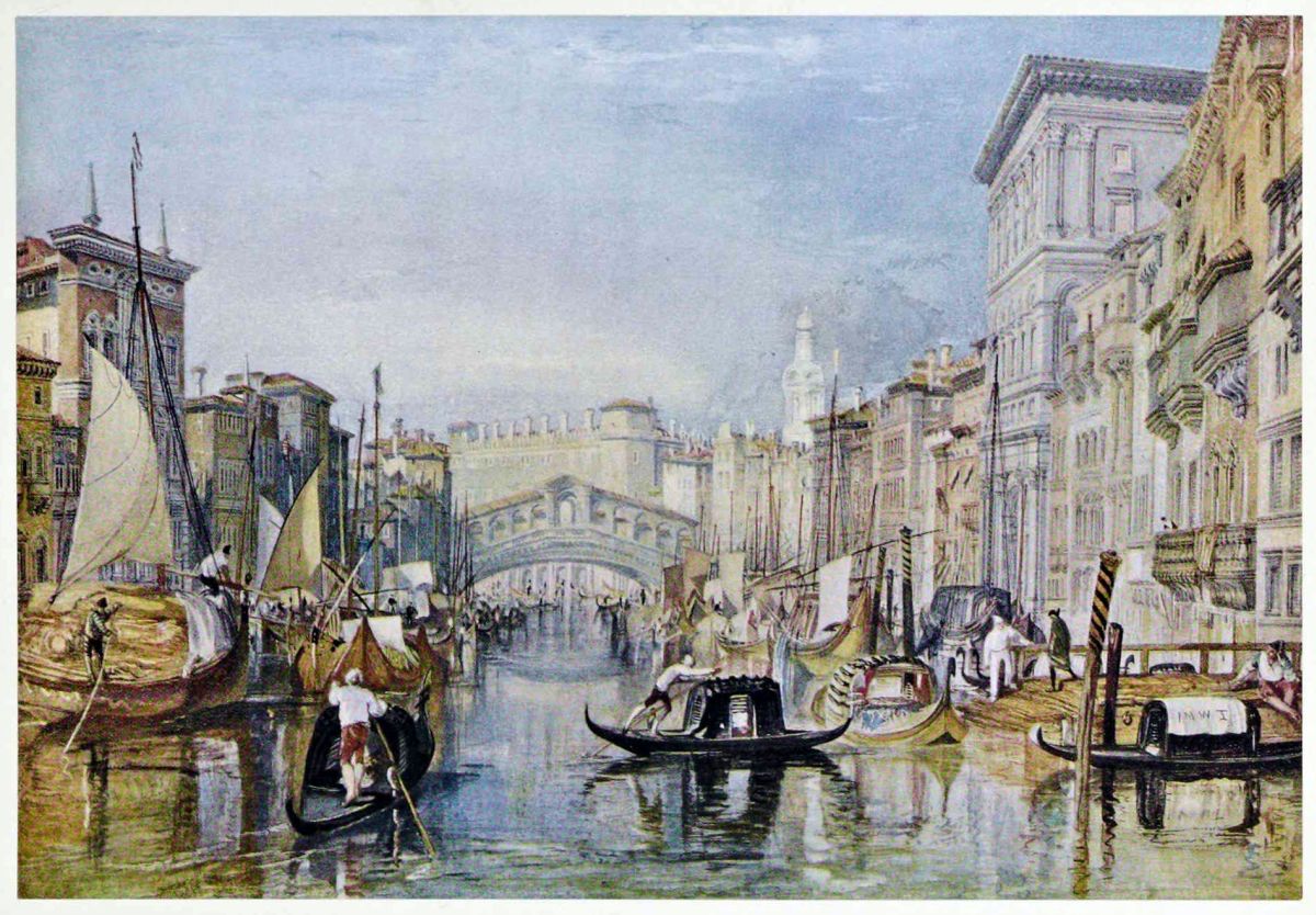 This drawing is frequently mistaken for the original of the engraving of the same subject published in Hakewill’s “Italy” (Rawlinson’s “Engraved Work of J. M. W. Turner,” p. 80), but the differences between the drawing and the engraving are too marked and extensive for this to be possible. The Hakewill drawing was made before Turner visited Venice, from camera obscura sketches by Hakewill. The Farnley drawing was made immediately after Turner’s return from Italy in 1820, from his own sketches. It is interesting as being Turner’s first Venetian picture.