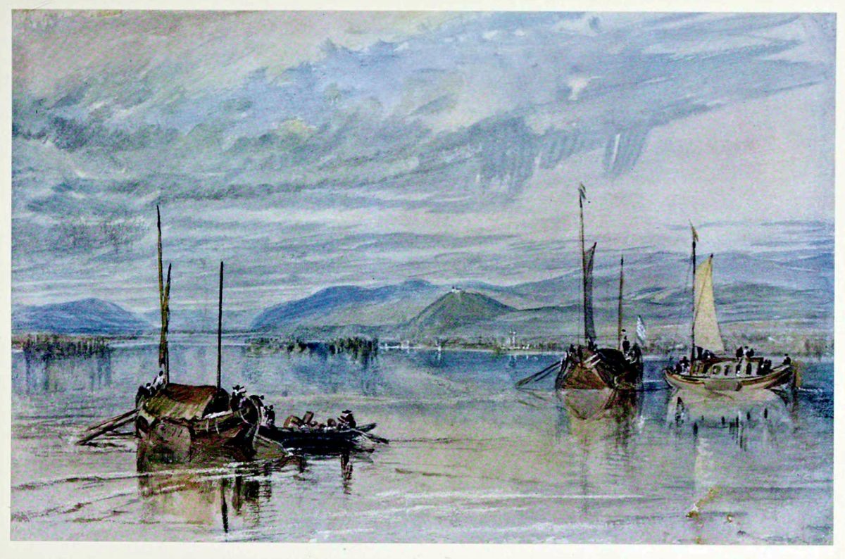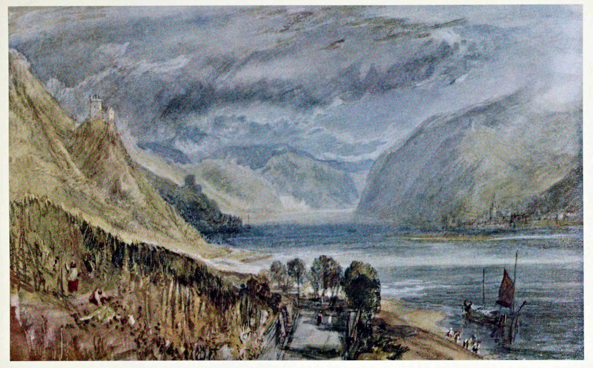 One of the Rhine drawings. The dark cloud in the centre is an instance of Turner’s wonderful technical daring and resource, the effect being obtained by the use of wet, running colour. Turner was at Mayence on 24th and 25th August, 1817.