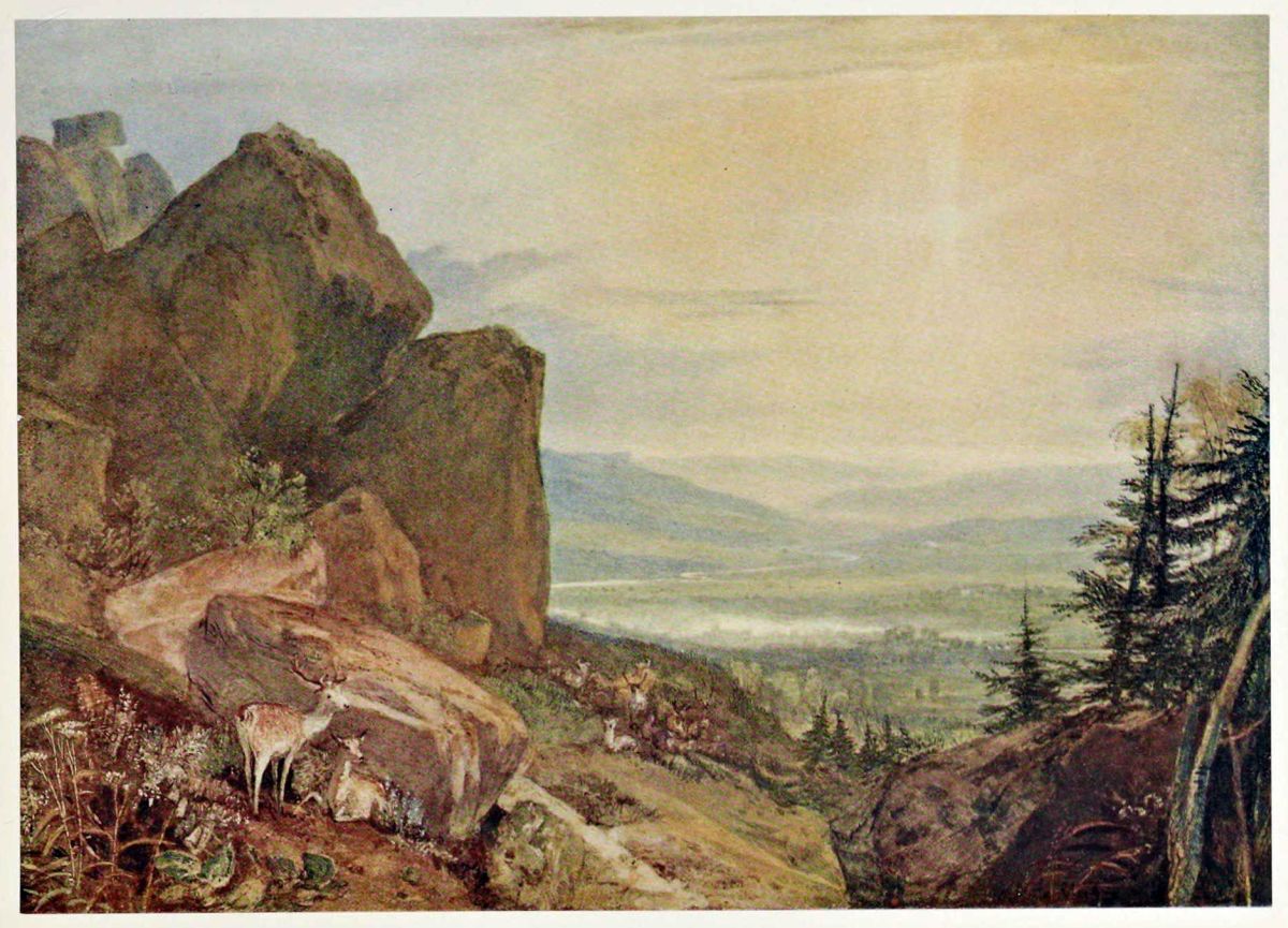 The first point of connection between Mr. Fawkes and Turner thus seems to have been the scenery of Switzerland and not that of Yorkshire. In a description I have seen of Farnley Hall and its treasures, written soon after it came into the possession of Mr. Walter Fawkes, the only pictures mentioned are a series of “romantic landscapes in Switzerland and Italy, admirably executed by Warwick and Smith.” The “Warwick and Smith” of this description is probably a misprint for “Warwick Smith,” the name by which John Smith, one of the earlier English water-colour painters, was generally known. This series of Smith’s water-colours is still preserved in one of the lumber rooms at Farnley Hall. The drawings represent generally the same subjects as those which Turner treated. Smith’s drawings are nearly all in monochrome, and, though they are not without merit, they look very dull and old-fashioned when compared with {2}the Turners. It seems to me, therefore, extremely probable that Mr. Fawkes was first attracted to Turner as the rising young artist of his day, who was doing the same kind of work as Warwick Smith had done, but who was doing it with much more imagination, vigour, and artistic skill. If this surmise be correct, Turner made his first appearance at Farnley Hall as the successor and transplanter of Warwick Smith. His artistic function was to replace Smith’s rather dull and laboured transcripts with his own brilliant and imaginative drawings.