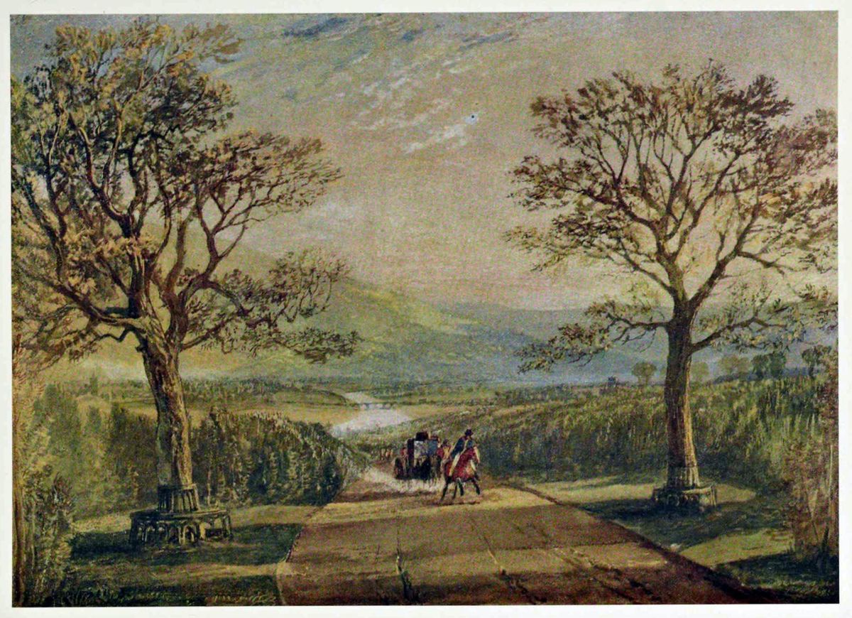 The water-colours Turner made from the sketches taken during this year are among the sunniest and happiest of his works. The lovely Hornby Castle from Tatham Church (now in the Victoria and Albert Museum), and the Crook of the Lune (in the Rev. W.{8} Macgregor’s collection) are perhaps the finest now existing of this series. But the happiness and pure enjoyment of life that breathe through these drawings must have been due to the artist’s memories and associations, rather than to his actual experiences of the places represented, for the weather seems to have been consistently bad during the whole of this summer and autumn. In the letter to Mr. Holworthy referred to above, Turner wrote that his present trip had been “a most confounded fagg.” Though he was on horseback, he added, “the passage out of Teesdale leaves everything far behind for difficulty—Bogged most compleatly, Horse and its Rider, and nine hours making 11 miles.” And in another part of the same letter, he wrote, “As to weather, there is nothing inviting, it must be confessed. Rain, rain, rain, day after day. Italy deluged, Switzerland a wash-pot, Neufchatel, Berne and Morat Lakes all in one—all chance of getting over the Simplon or any of the passes now vanished like the morning mist.” So the writer had evidently nursed some project of going to Italy in the latter part of this year, a project which he was not able to carry out till two years later.