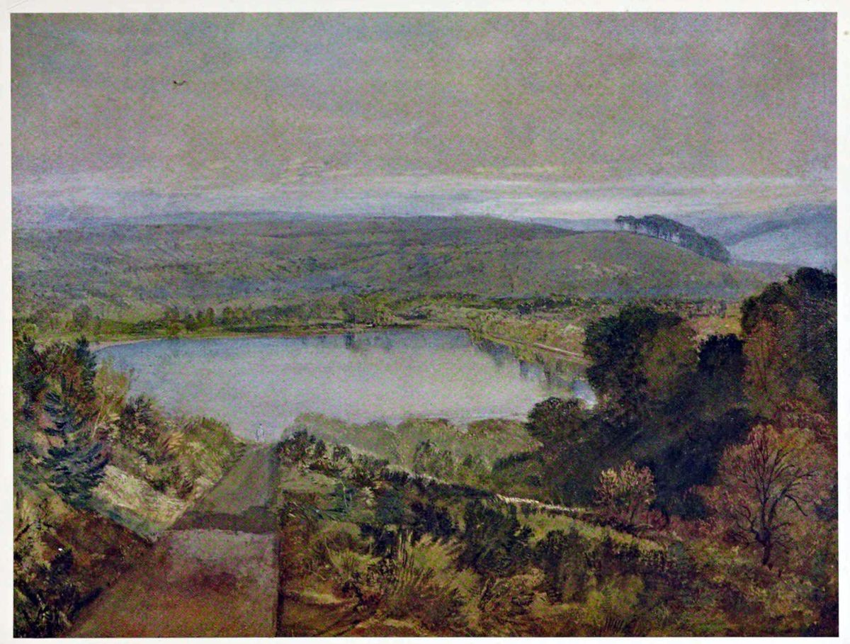 This drawing is executed in body-colour on brown paper. The River Washburne, with water-mill, is seen in the foreground, Leathley Church on the hill in the middle-distance, and the Otley Chevin, with Caley Park, beyond. The steep wooded bank on the right of the river in the middle-distance is the scene of the drawing The Banks of the Washburne (Plate XI). The drawing of The Valley of the Washburne, and Lindley Bridge (Plate XIX) was made from a spot near the mill in the foreground, looking towards the right.