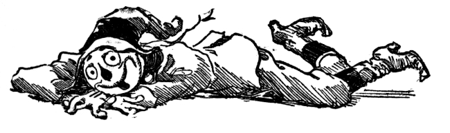 That was what Snip heard Mombi mumble, bending over a peppery mixture on the fire. So dreadful was her expression as she scowled into the frying pan that Snip tumbled from the window sill into a rose bush. Picking himself up, he rushed down the garden path convinced that the King was done for. But there was Kinda Jolly, with his silver crown, walking calmly under the button trees. Snip looked again to be sure Kinda was not turning to a collar button and then, a little ashamed of being so easily frightened, he crept back to the ledge to see what Mombi would do next. He was just in time to see her fling the frying pan down the cellar steps and kick over a basket of potatoes. Then, grumbling and snarling and rubbing her shins, she limped into the garden to fetch the goose Kinda Jolly had bought for dinner—for magic or no magic the cooking had to be attended to. The goose had come straight from a neighboring farm and was still in the flimsy wooden crate. Scowling and scolding, Mombi slammed the crate on the table and ripped off the top slats.