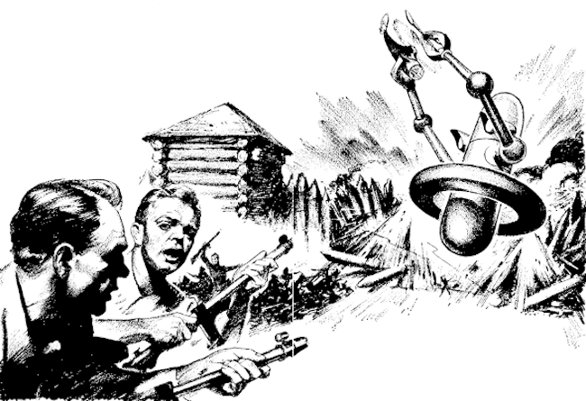 The other sentry rushed to the corner. One glance was enough to tell him what had happened. He grabbed the huge spotlamp at the juncture of the two walls and tripped the button. Inside the stockade a generator whined and the arc of the lamp flared its sunbright blue.
