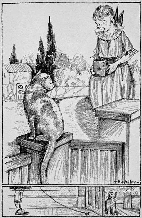 One afternoon in the summer time the little girl thought of something to do of which Dump had not thought. It was this. The girl had a nice little kodak which her uncle had given her and she thought of taking Dump’s picture. Not very many kittens are fortunate enough to have their pictures taken. The little kitten had never posed for a picture and of course thought it was great fun, that is, if he thought of it at all. Anyway, they both went into the yard and the little girl placed Dump on the gate post. He seemed to know the purpose of being placed there for he sat still in the warm sun just like he was really posing for the picture. It was a good[27] picture, too, and the girl has the little picture yet, although she is grown now and has a home of her own and another kitten takes Dump’s place.