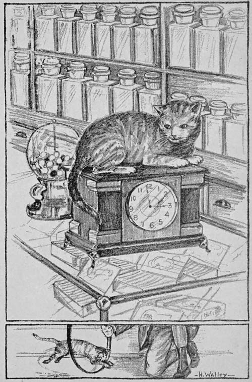 Another thing which attracted much attention from the employees and customers was that Tiger would try to get into any kind of box left open or set out for him. He never forgot this and after becoming a full grown cat he would try to get into little boxes. Sometimes Frank or one of the clerks would give him a small paste board box and tell him to lie down in it. He would turn ’round and ’round in it until the sides were mashed and then he would lie down on the flat piece of the box. Sometimes they would give him a very small pill box and he would try to get into it. He would walk all around it and at last would lie down on top of it.