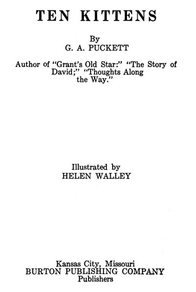 The stories of the ten kittens told in this book are true to life. They have been gathered from here and there over the country. All the kittens have lived and played their little parts in the life history as told in each chapter.