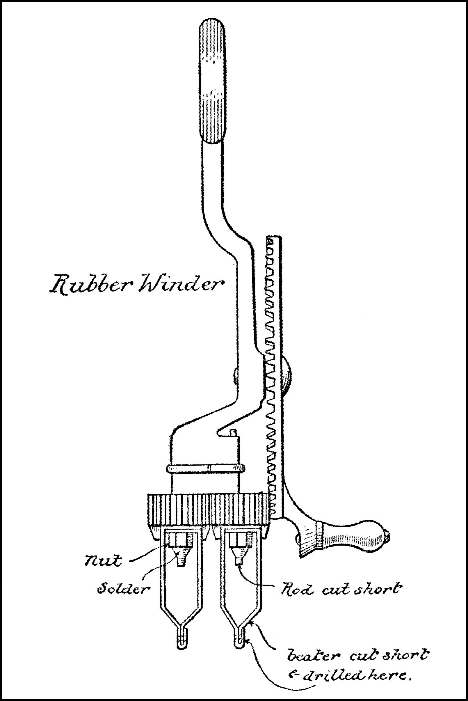 Winder—An apparatus used for winding two sets of rubber strands at the same time in opposite directions or one at a time. Very often made from an egg beater or hand drill.